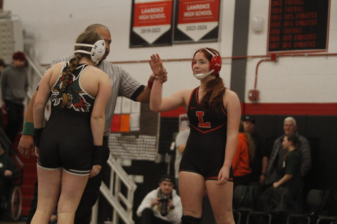 Lawrence senior Goldy Stephens gets her hand raised after a senior night pin in the City Showdown wrestling dual at Lawrence on Jan. 21, 2026, in Lawrence.