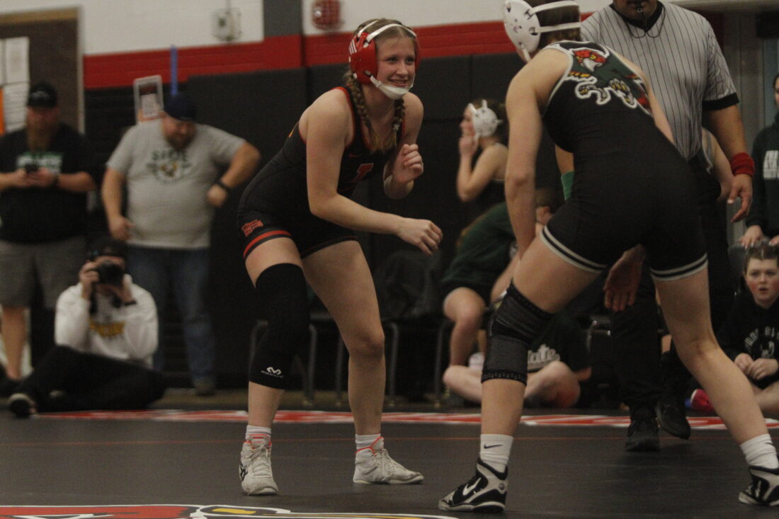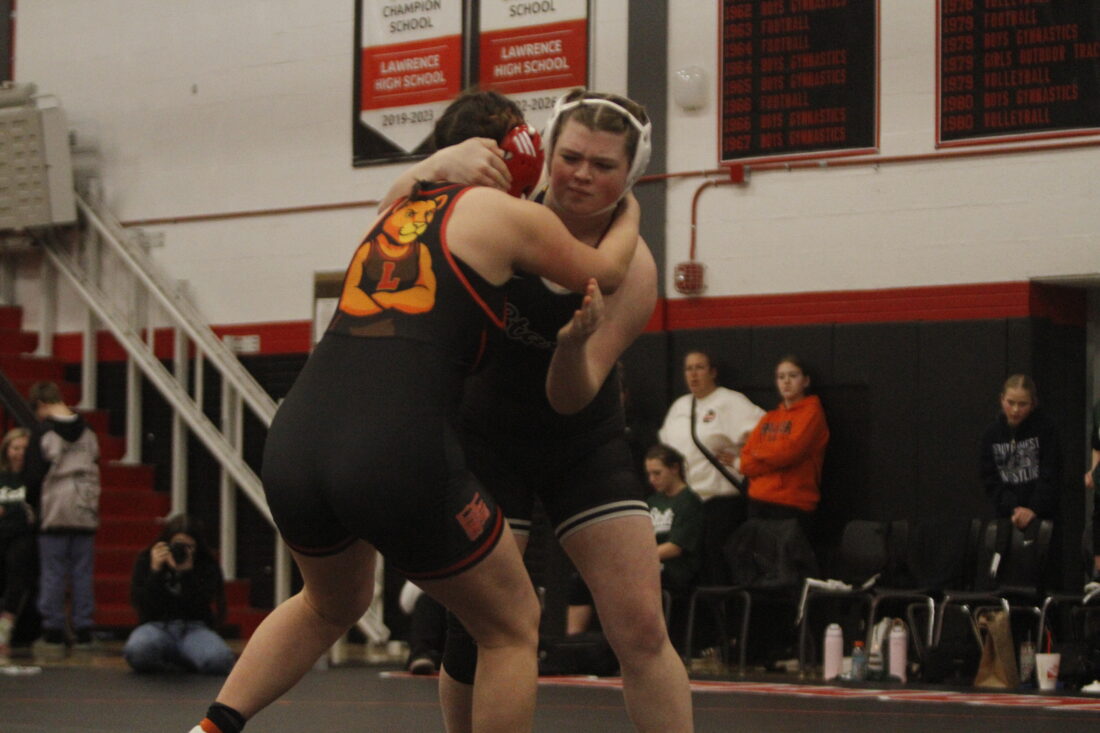 Lawrence’s Ivy Ford faces Free State’s Delaney Earl in the City Showdown wrestling dual at Lawrence on Jan. 21, 2026, in Lawrence.