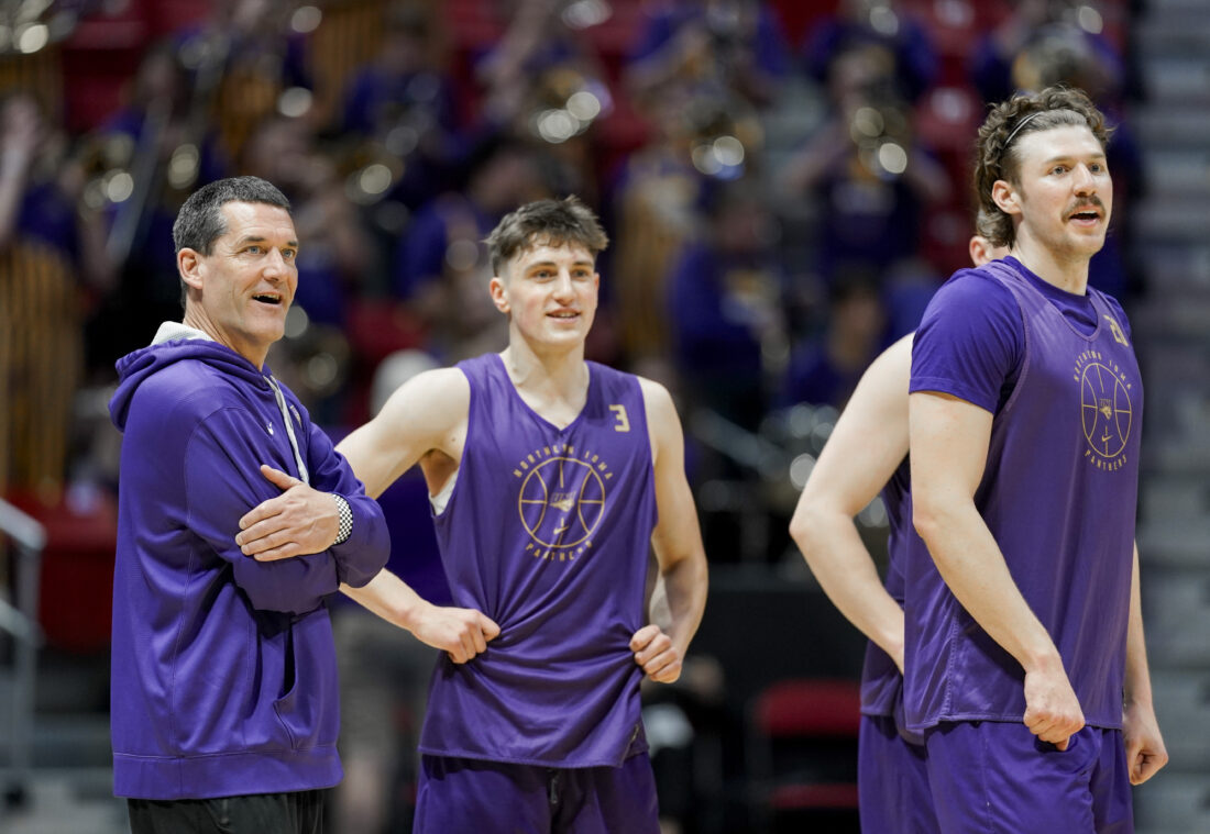 Northern Iowa head coach Ben Jacobson watches his players shoot half-court shots during practice on Thursday, March 19, 2026 at Viejas Arena in San Diego. Photo by Nick Krug