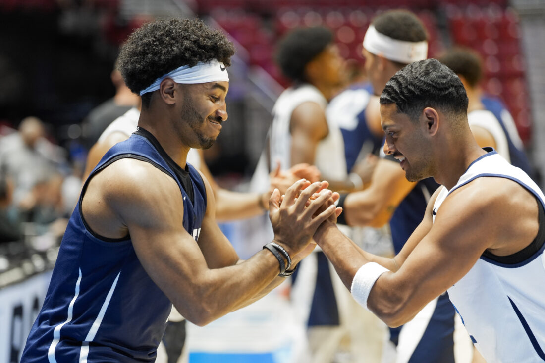 California Baptist guard Dominique Daniels Jr. (1), left, and California Baptist guard Jalen Dollar (2) get warmed up during practice on Thursday, March 19, 2026 at Viejas Arena in San Diego. Photo by Nick Krug