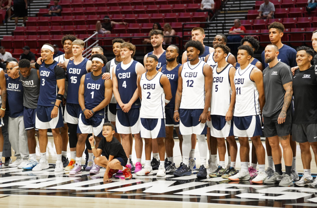 California Baptist players and coaches stand at center court for a team photo prior to the start of practice on Thursday, March 19, 2026 at Viejas Arena in San Diego. Photo by Nick Krug