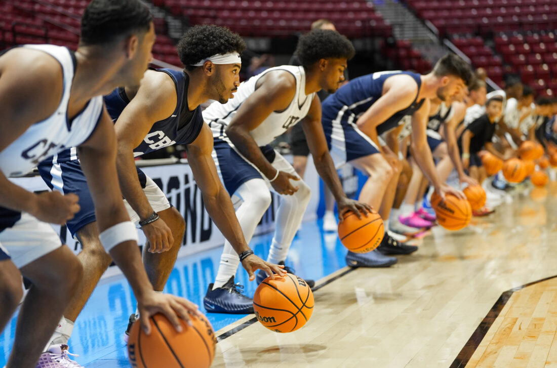 California Baptist guard Dominique Daniels Jr., second from left, runs through dribbling drills during practice on Thursday, March 19, 2026 at Viejas Arena in San Diego. Photo by Nick Krug