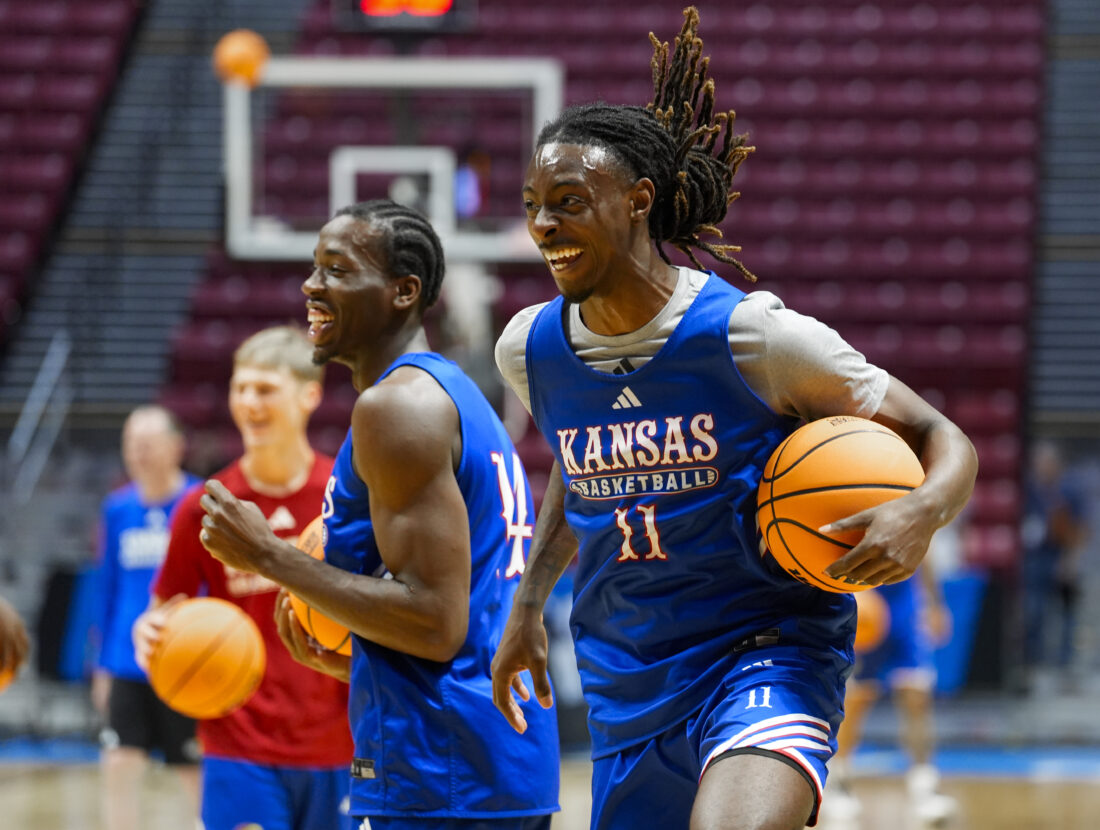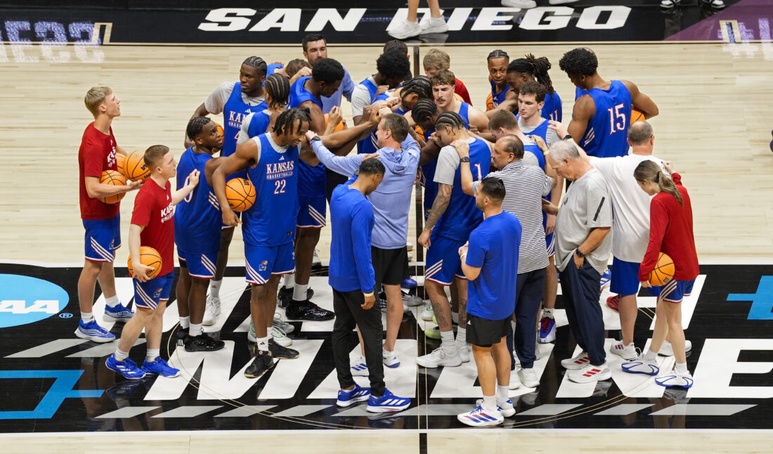 Kansas players shoot around toward the end of practice on Thursday, March 19, 2026 at Viejas Arena in San Diego. Photo by Nick Krug