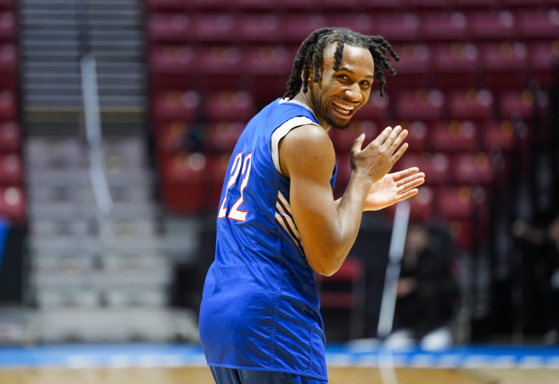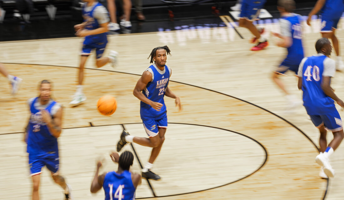 Kansas guard Darryn Peterson (22) runs through a weave passing drill during practice on Thursday, March 19, 2026 at Viejas Arena in San Diego. Photo by Nick Krug