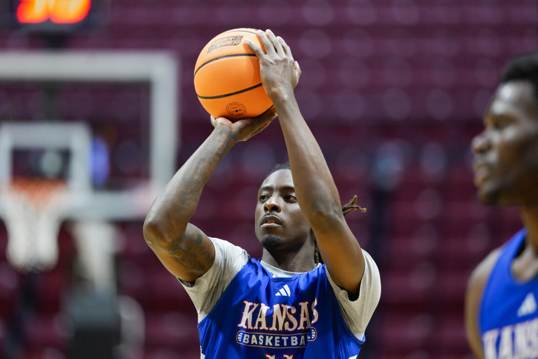 Kansas guard Jamari McDowell (11) puts up a shot during practice on Thursday, March 19, 2026 at Viejas Arena in San Diego. Photo by Nick Krug