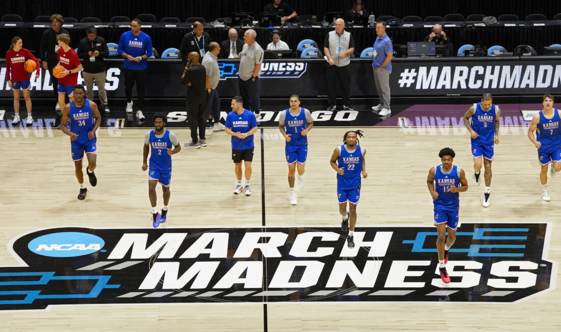 Kansas players run across center court as they get warmed up at the start of practice on Thursday, March 19, 2026 at Viejas Arena in San Diego. Photo by Nick Krug