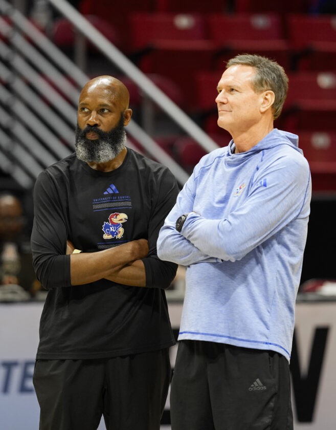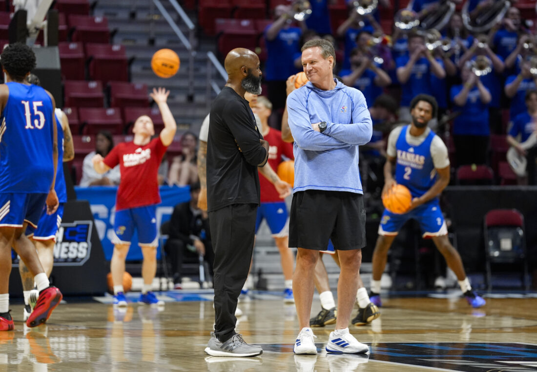 Kansas head coach Bill Self and assistant Jacque Vaughn talk during practice on Thursday, March 19, 2026 at Viejas Arena in San Diego. Photo by Nick Krug