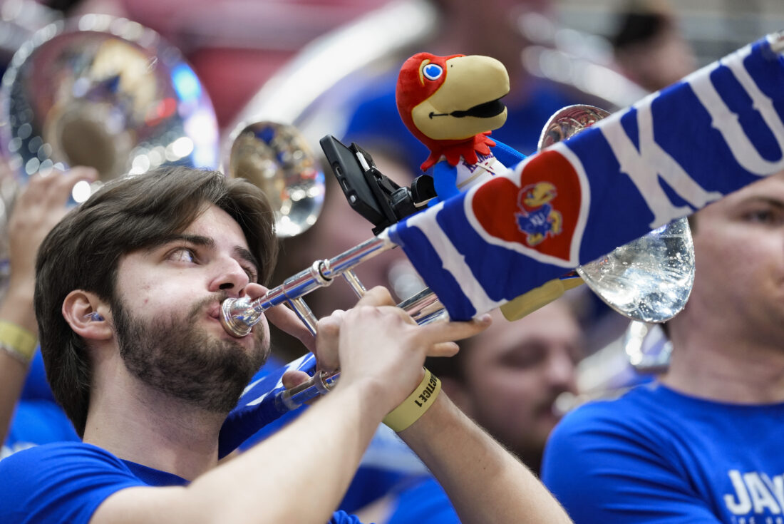 Carter Stokes, a Kansas junior from Olathe, plays the trombone during the Jayhawks’ practice on Thursday, March 19, 2026 at Viejas Arena in San Diego. Photo by Nick Krug