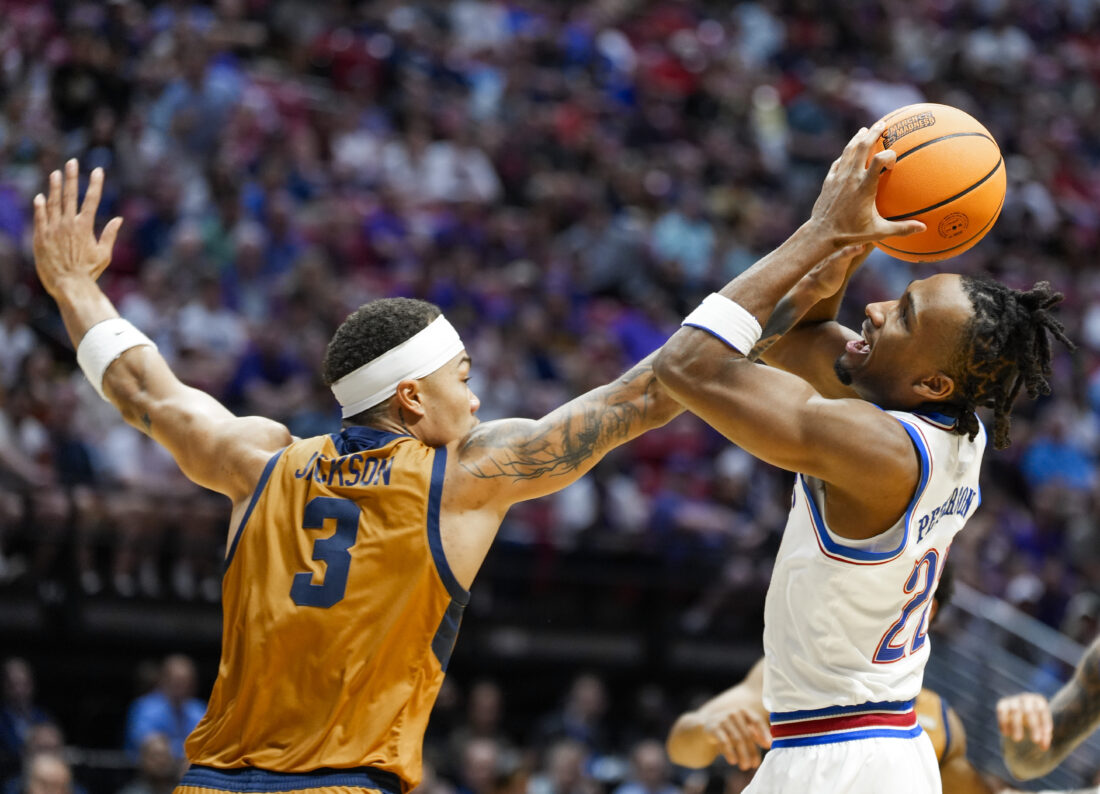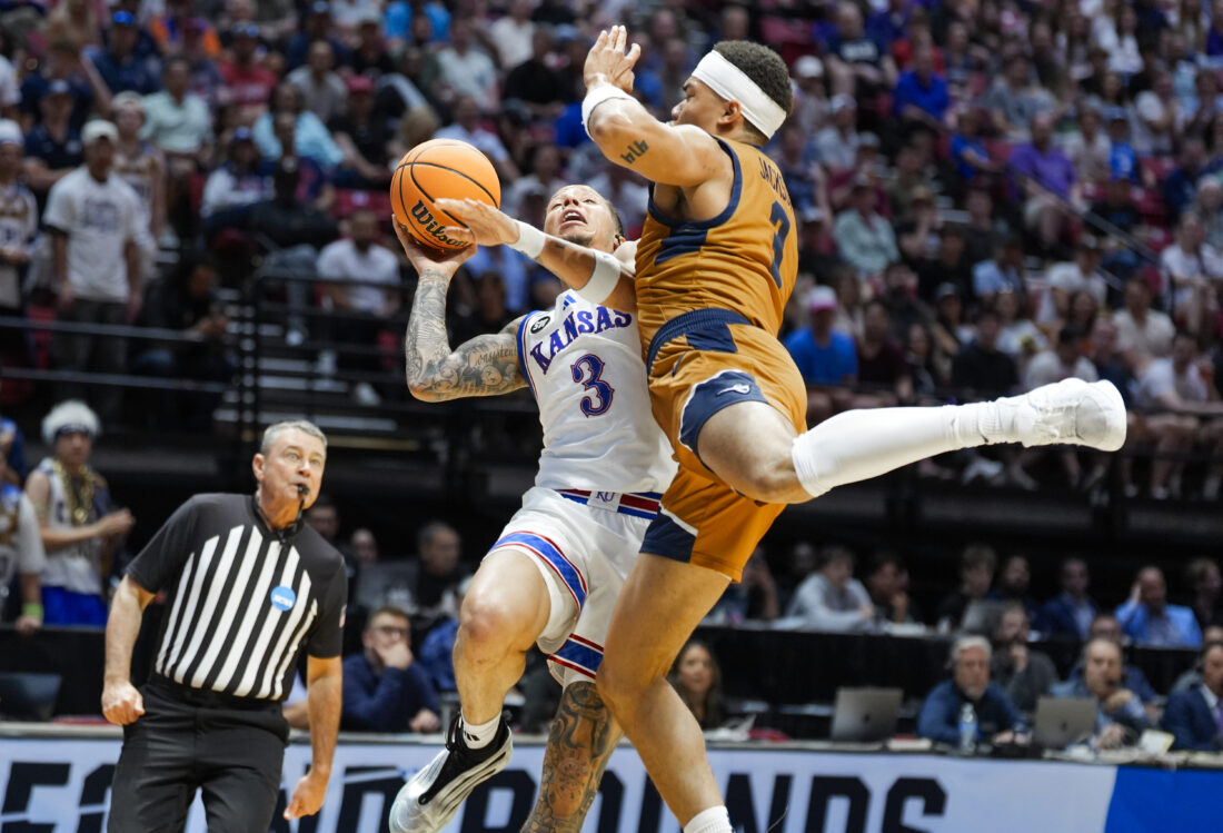Kansas guard Tre White (3) draws a foul from California Baptist guard Jayden Jackson (3) during the first half on Friday, March 20, 2026 at Viejas Arena in San Diego. Photo by Nick Krug