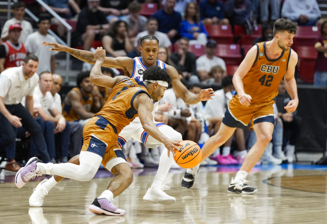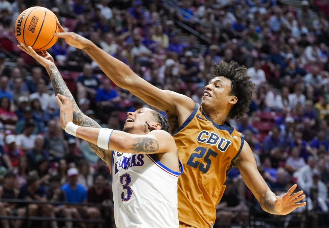 California Baptist forward Jonathan Griman (8) pulls a rebound from Kansas forward Flory Bidunga (40) during the second half on Friday, March 20, 2026 at Viejas Arena in San Diego. Photo by Nick Krug
