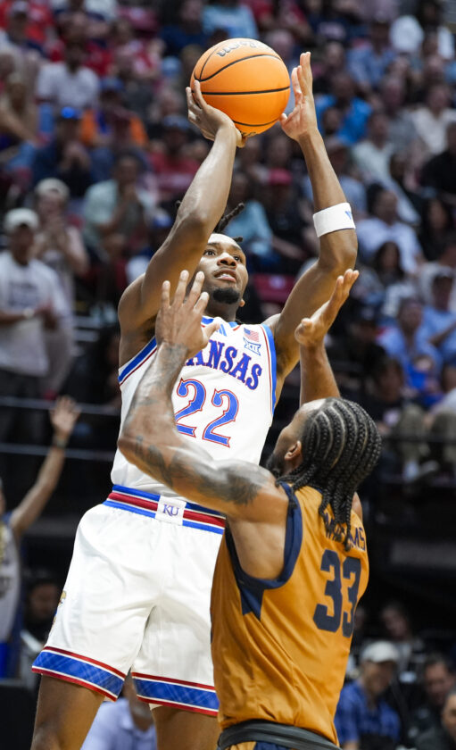 Kansas guard Darryn Peterson (22) pulls up over California Baptist guard Martel Williams (33) during the first half on Friday, March 20, 2026 at Viejas Arena in San Diego. Photo by Nick Krug