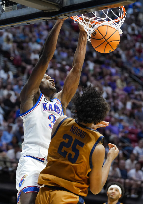 Kansas center Paul Mbiya (34) dunks over California Baptist forward Thomas Ndong (25) during the first half on Friday, March 20, 2026 at Viejas Arena in San Diego. Photo by Nick Krug
