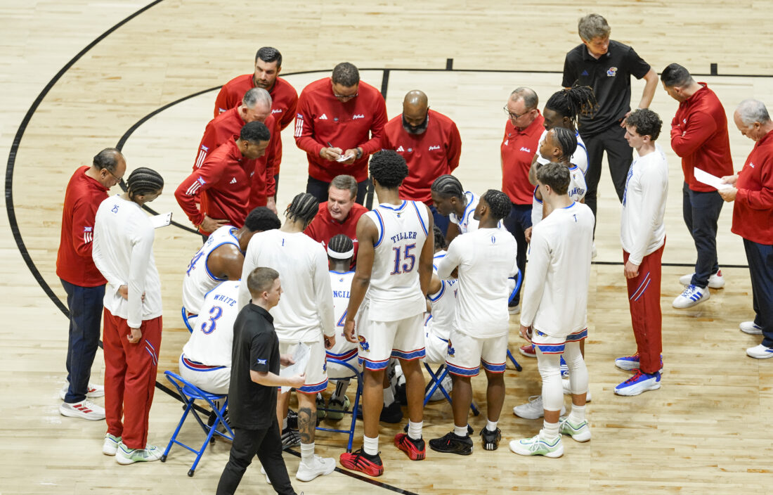 Kansas head coach Bill Self grills his players in the huddle during the first half on Friday, March 20, 2026 at Viejas Arena in San Diego. Photo by Nick Krug