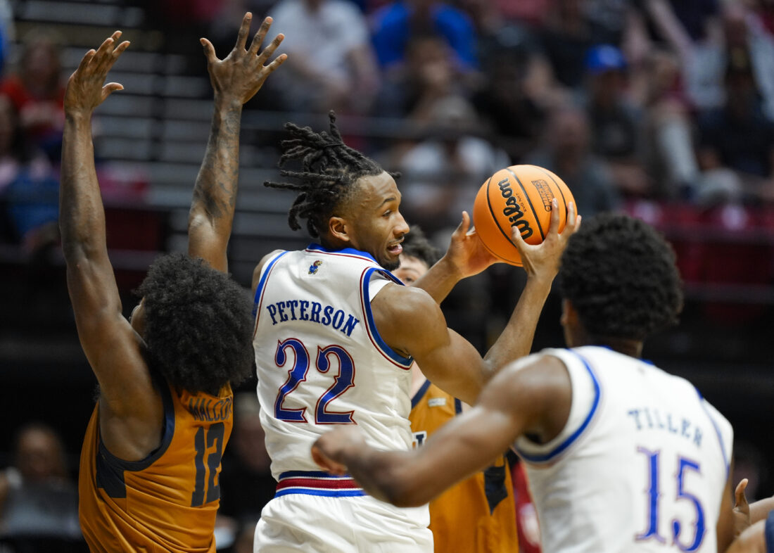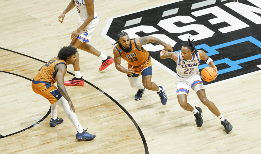 Kansas guard Darryn Peterson (22) drives against California Baptist guard Martel Williams (33) and California Baptist forward Devon Malcolm (12) during the first half on Friday, March 20, 2026 at Viejas Arena in San Diego. Photo by Nick Krug