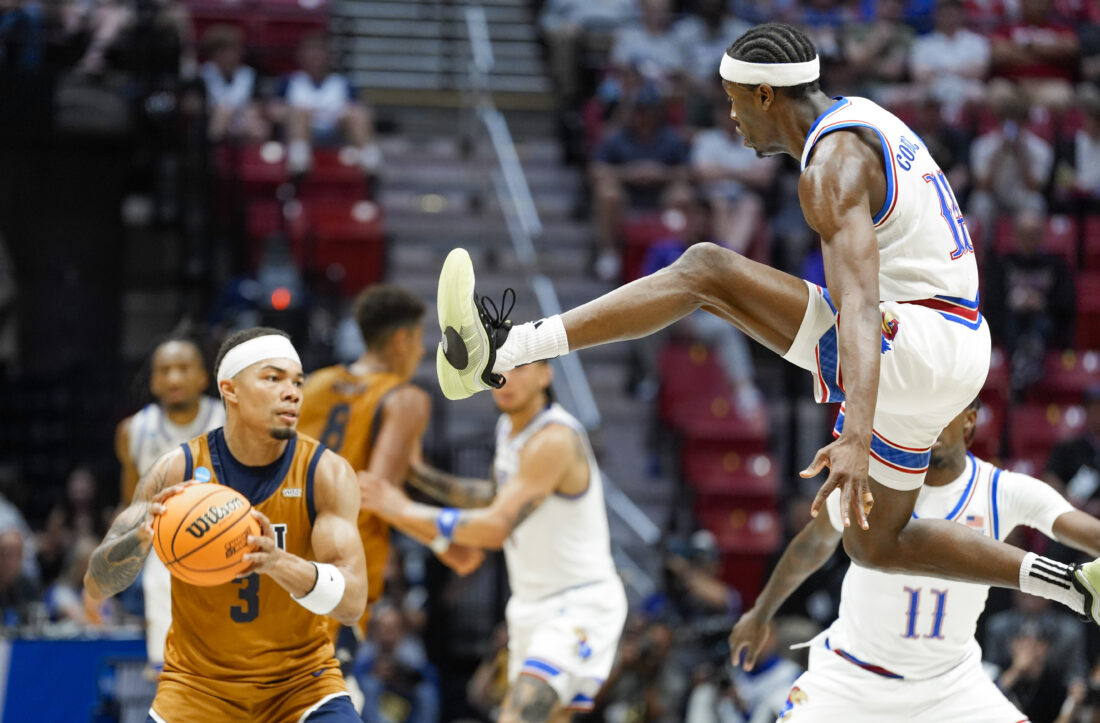 Kansas guard Melvin Council Jr. (14) defends against a pass from California Baptist guard Jayden Jackson (3) during the first half on Friday, March 20, 2026 at Viejas Arena in San Diego. Photo by Nick Krug