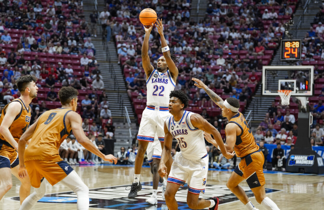 Kansas guard Darryn Peterson (22) puts up a three against California Baptist during the second half on Friday, March 20, 2026 at Viejas Arena in San Diego. Photo by Nick Krug