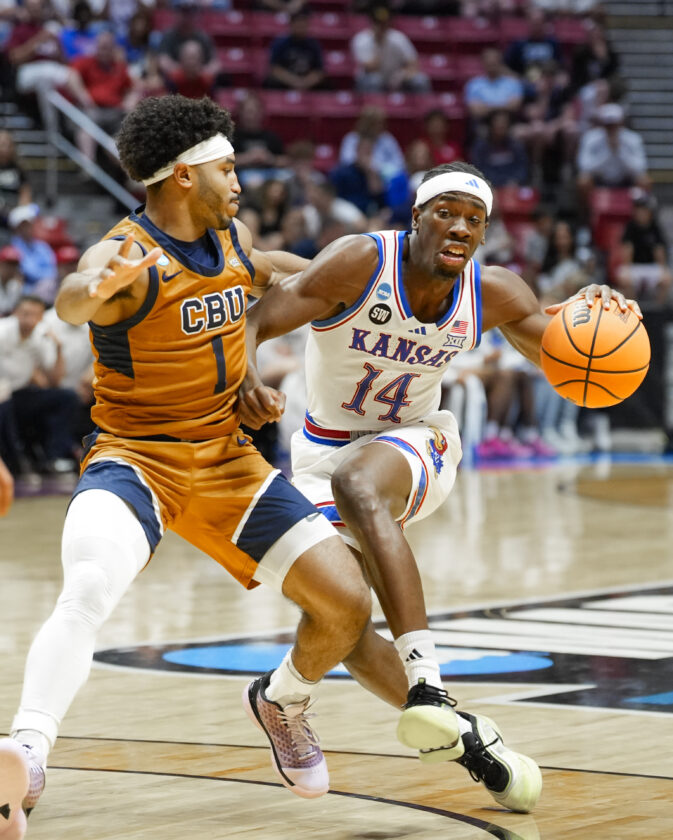 Kansas guard Melvin Council Jr. (14) is pressured by California Baptist guard Dominique Daniels Jr. (1) during the second half on Friday, March 20, 2026 at Viejas Arena in San Diego. Photo by Nick Krug