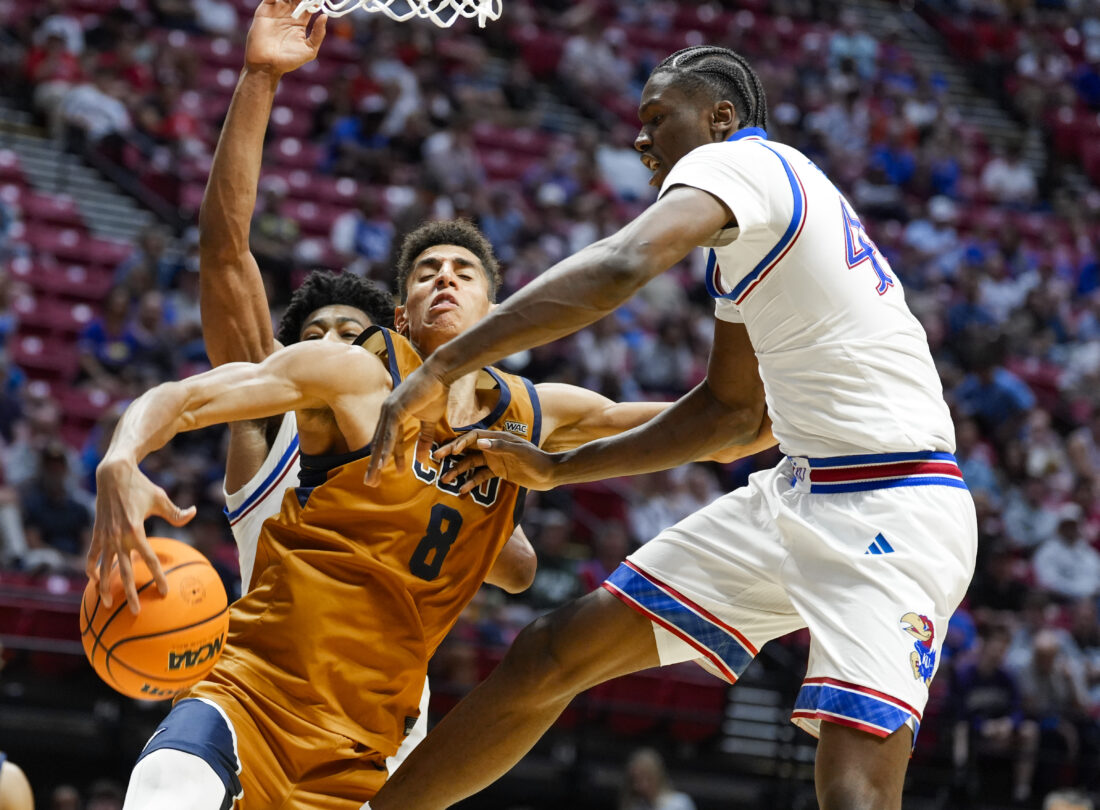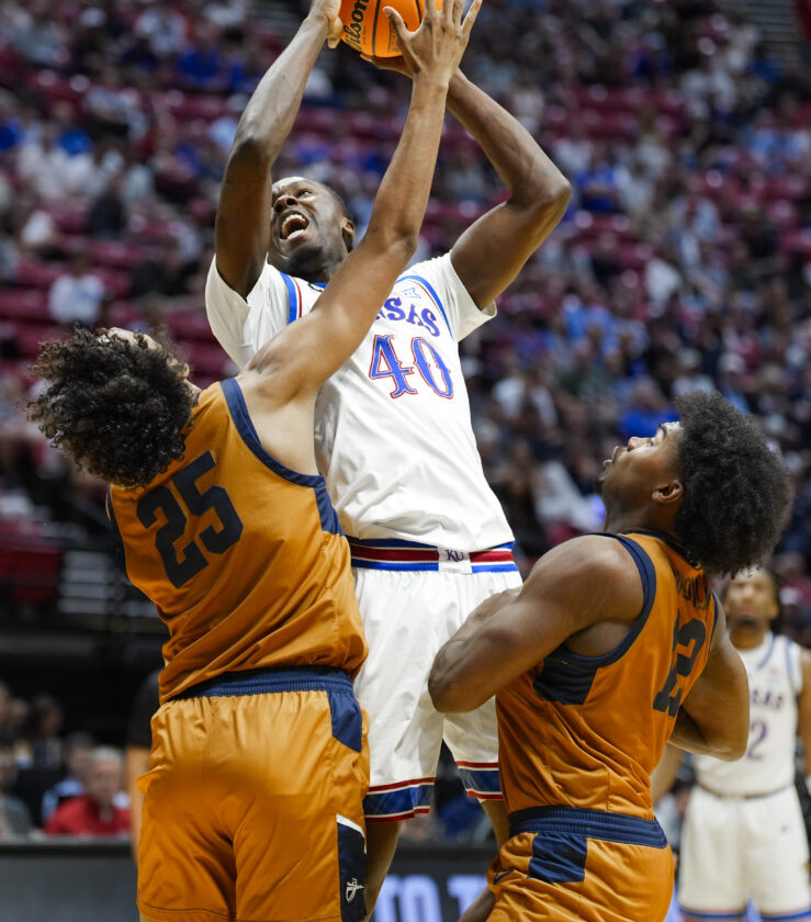 Kansas forward Flory Bidunga (40) fights in the post against California Baptist forward Thomas Ndong (25) and California Baptist forward Devon Malcolm (12) during the second half on Friday, March 20, 2026 at Viejas Arena in San Diego. Photo by Nick Krug