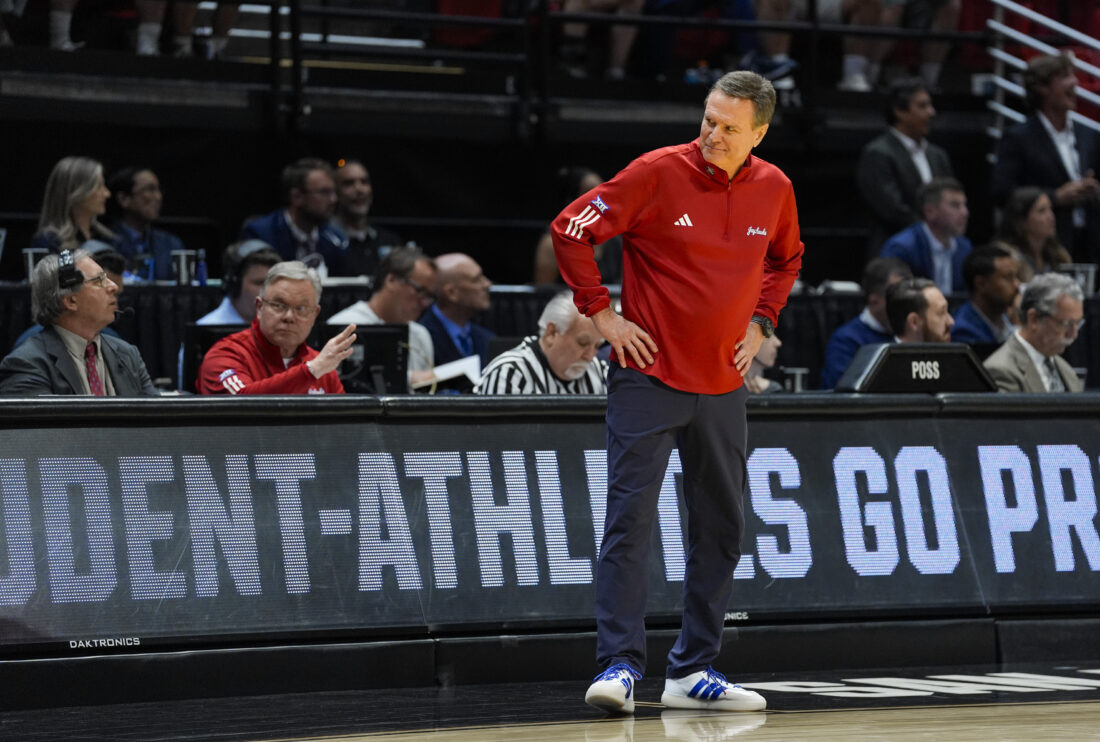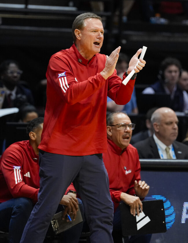 Kansas head coach Bill Self looks down the bench during a late run by California Baptist on Friday, March 20, 2026 at Viejas Arena in San Diego. Photo by Nick Krug