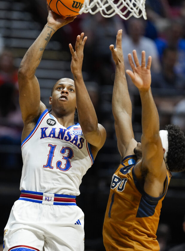 Kansas guard Elmarko Jackson (13) puts up a shot against California Baptist guard Dominique Daniels Jr. (1) during the second half on Friday, March 20, 2026 at Viejas Arena in San Diego. Photo by Nick Krug