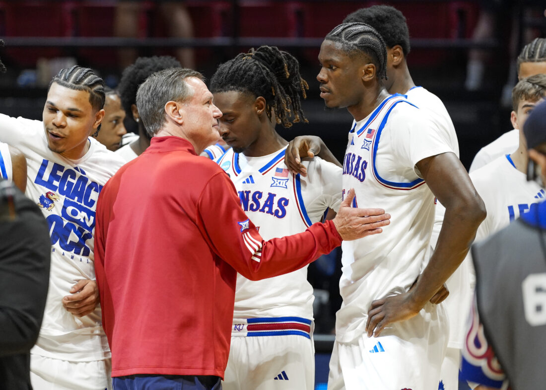 Kansas head coach Bill Self talks with Kansas forward Flory Bidunga (40) after the Jayhawks’ 68-60 win over California Baptist during the second half on Friday, March 20, 2026 at Viejas Arena in San Diego. Photo by Nick Krug