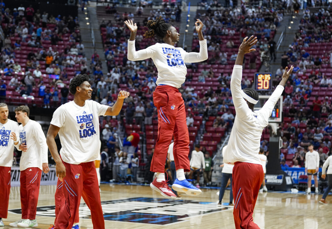 Kansas forward Bryson Tiller (15) and Kansas forward Flory Bidunga (40) toss Kansas guard Jamari McDowell (11) in the air prior to tipoff against California Baptist on Friday, March 20, 2026 at Viejas Arena in San Diego. Photo by Nick Krug
