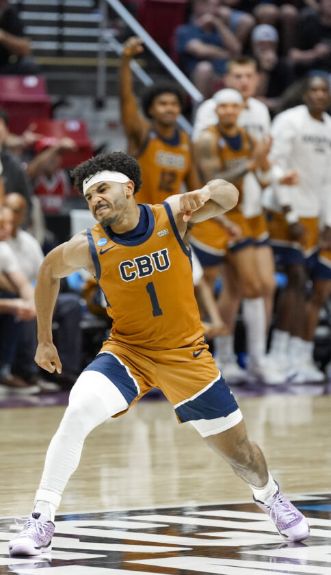 California Baptist guard Dominique Daniels Jr. (1) pumps his fist after an and-one bucket against Kansas during the second half on Friday, March 20, 2026 at Viejas Arena in San Diego. Photo by Nick Krug