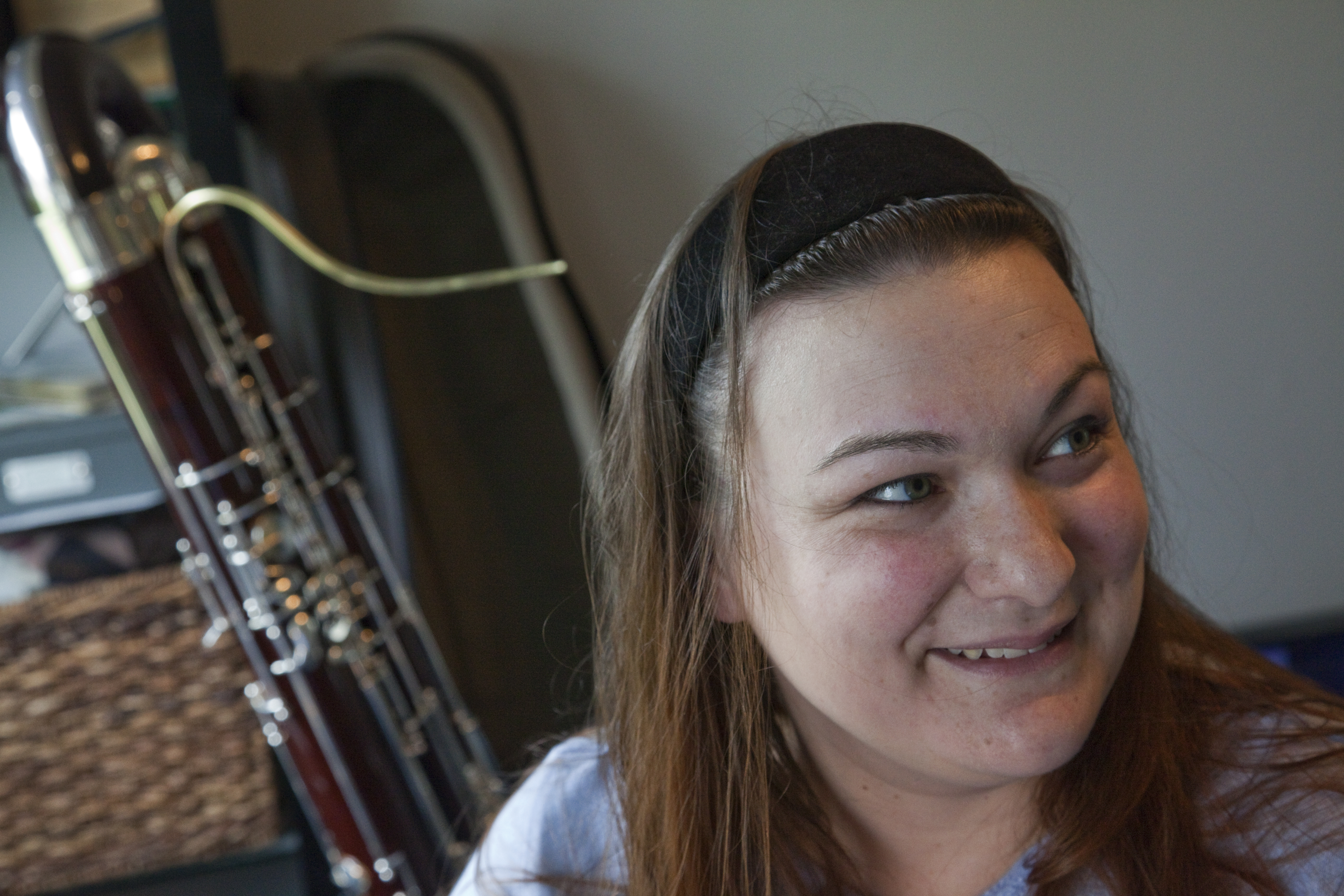 Leigh Miller Munoz checks her contrabassoon before trying a new reed. Munoz makes handmade reeds for bassoons and contrabassoons and sells them at gobassoon.com.