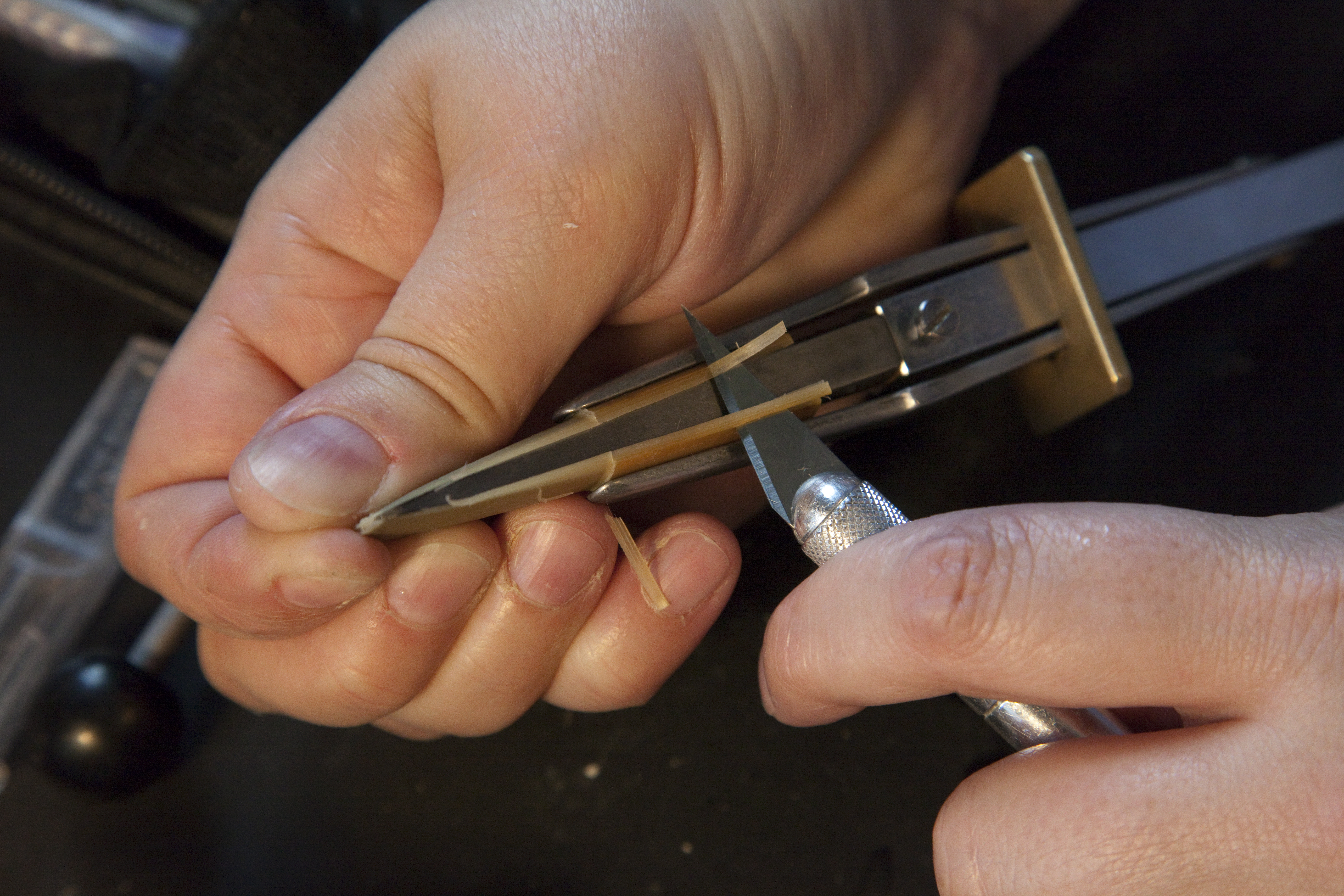 A special device holds a trimmed piece of bamboo while Leigh Miller Munoz carefully shaves it into shape with an X-acto knife. Munoz makes handmade reeds for bassoons and contrabassoons.