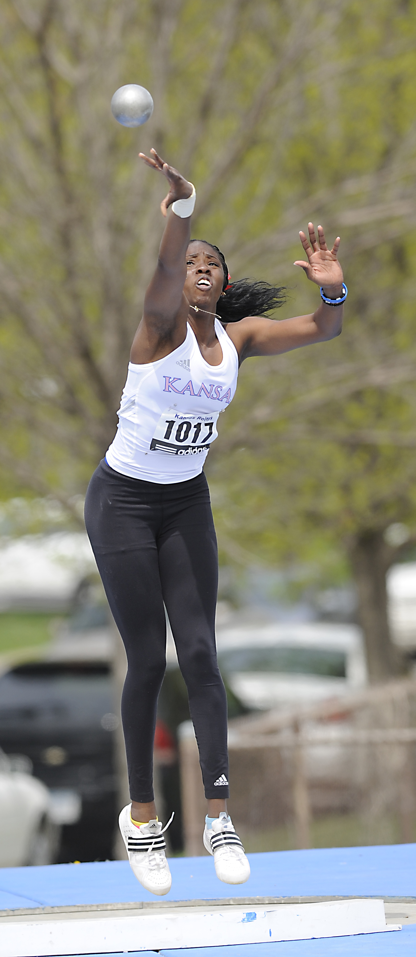 Kansas' Rebecca Neville throws the shot put 9.58 meters on Wednesday during the heptathlon on Wednesday April 19, 2011 in Memorial Stadium.