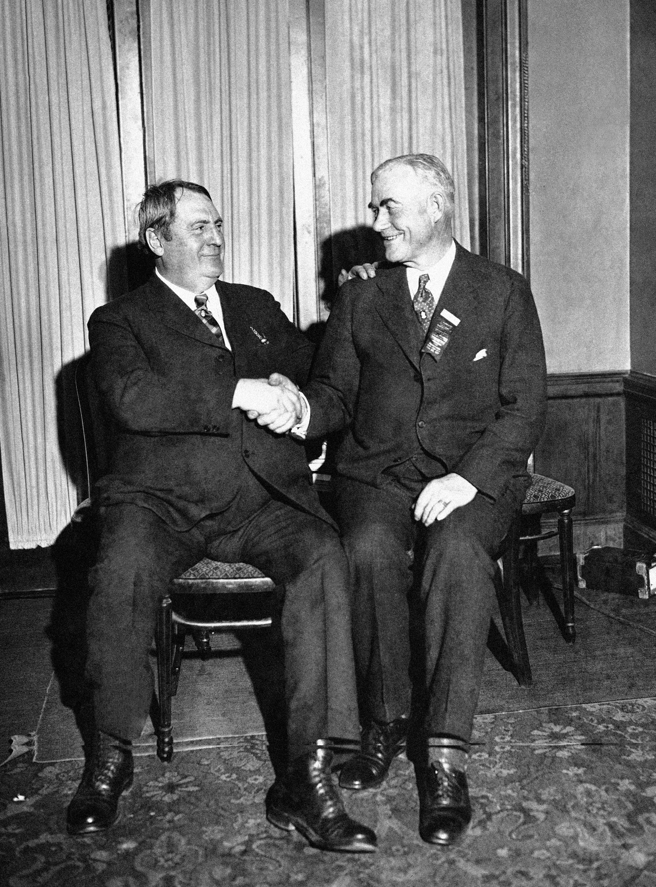 From left to right: Parke Davis, football statistic recorder and former football coach at Lafayette, Princeton and Wisconsin, and Fielding Yost, Michigan Coach, who played under Davis in 1896, recalled the old days at the eleventh annual meeting of the American Football Coaches Association at the Hotel Pennsylvania in New York City on Dec. 29, 1931. Yost coached KU in 1899, leading the team to a perfect 10-0 record.
