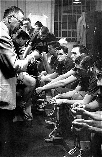 Better known for his success on the basketball court, Phog Allen coached the KU football team from in 1920, going 5-2-1. He's seen here giving his final instructions to his team before playing -- and winning -- the 1952 NCAA men's basketball championship game in Seattle. KU defeated St. John's, 80-63, for the title.