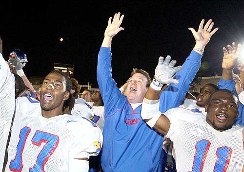 KU Coach Terry Allen, center, celebrates with Mario Kinsey, left, and Reggie Duncan. The Jayhawks downed Texas Tech, 34-31 in double overtime, on Saturday in Lubbock, Texas. Allen coached in Lawrence from 1997-2001, going 21-35.