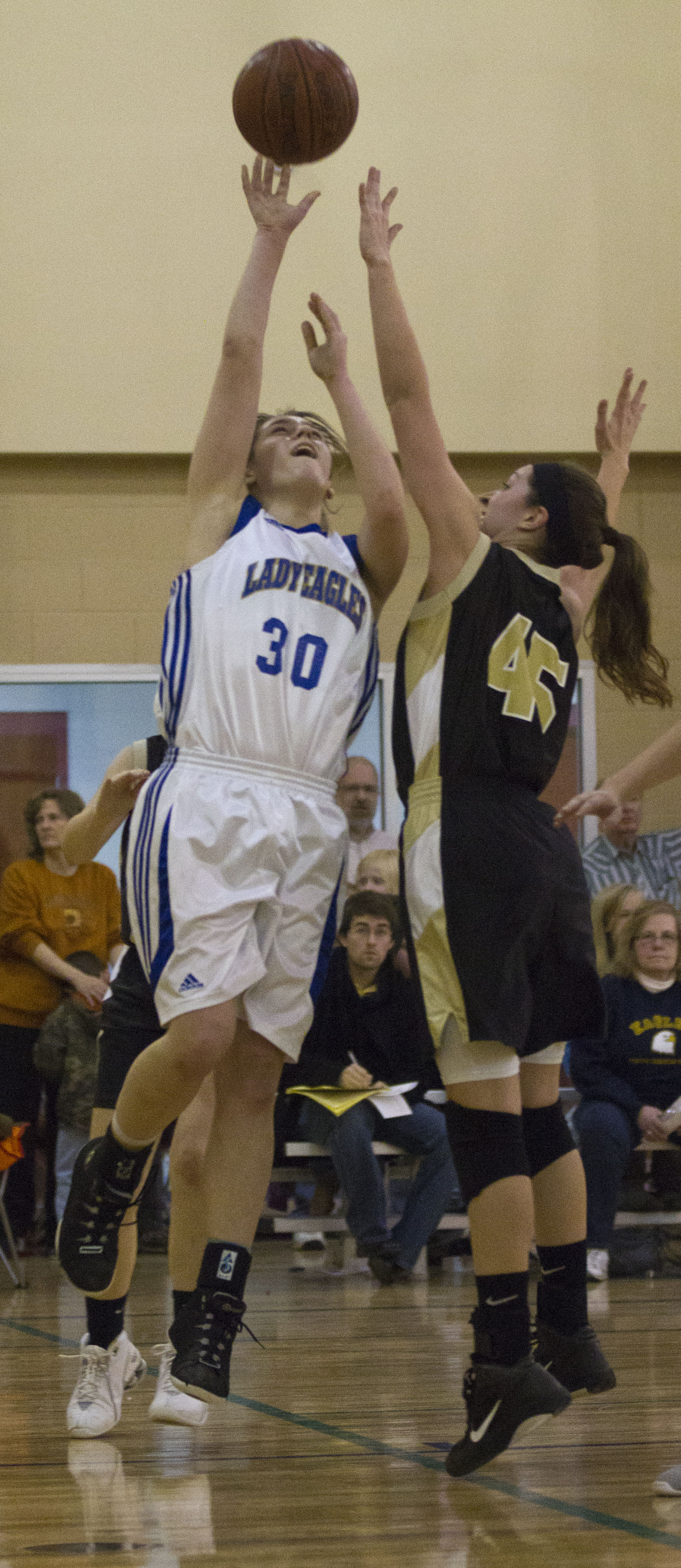Veritas’ Kristen Finger (30) shoots over defender Grace Williams (45) during Veritas’ game against Olathe Christian Saturday, Dec. 17, 2011 in Eudora.
