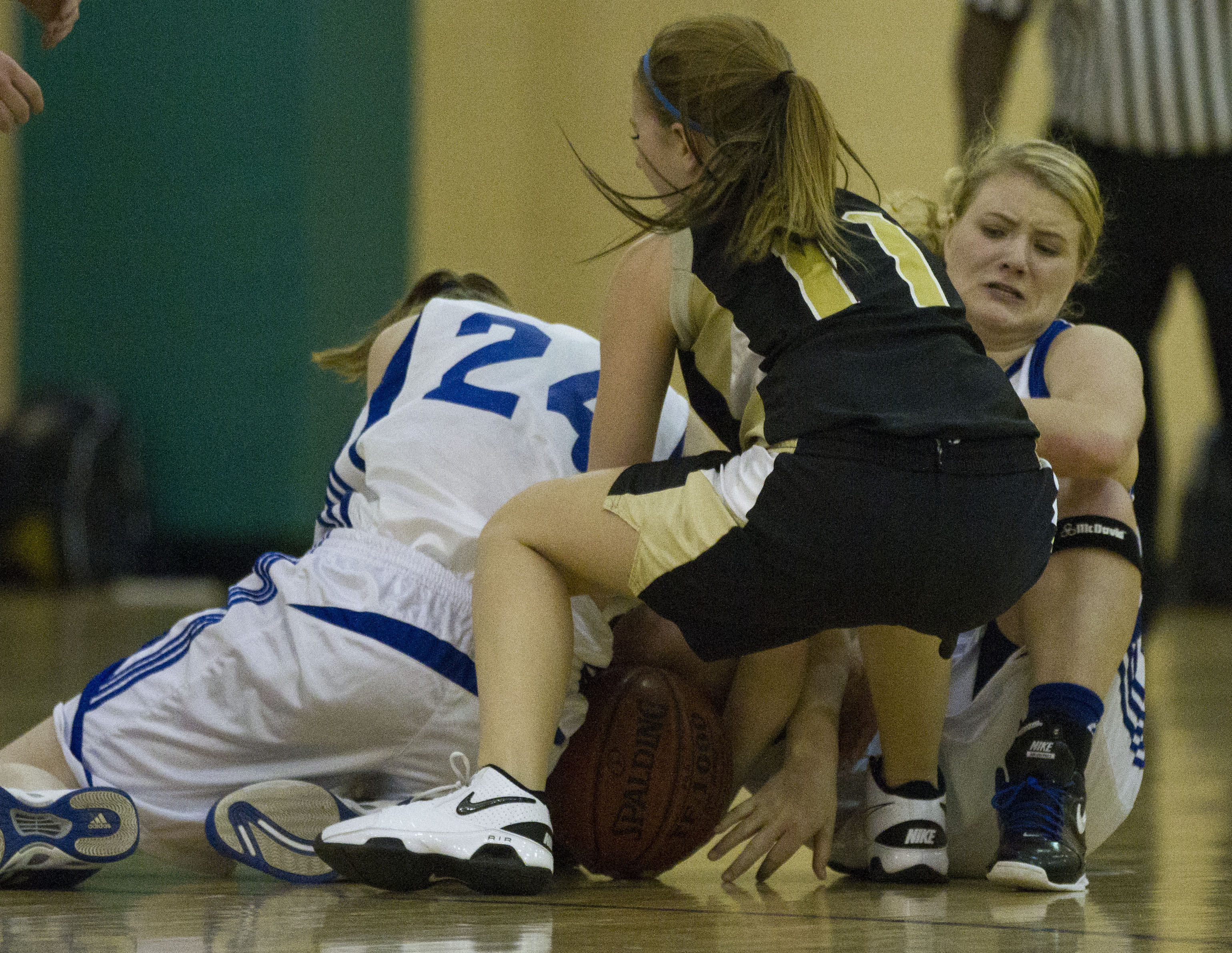 Olathe Christian’s Helyn Mann (11) takes the ball away from Ellen Phillips, left, and Madison Bennett during Veritas’ game against Olathe Christian Saturday, Dec. 17, 2011 in Eudora.