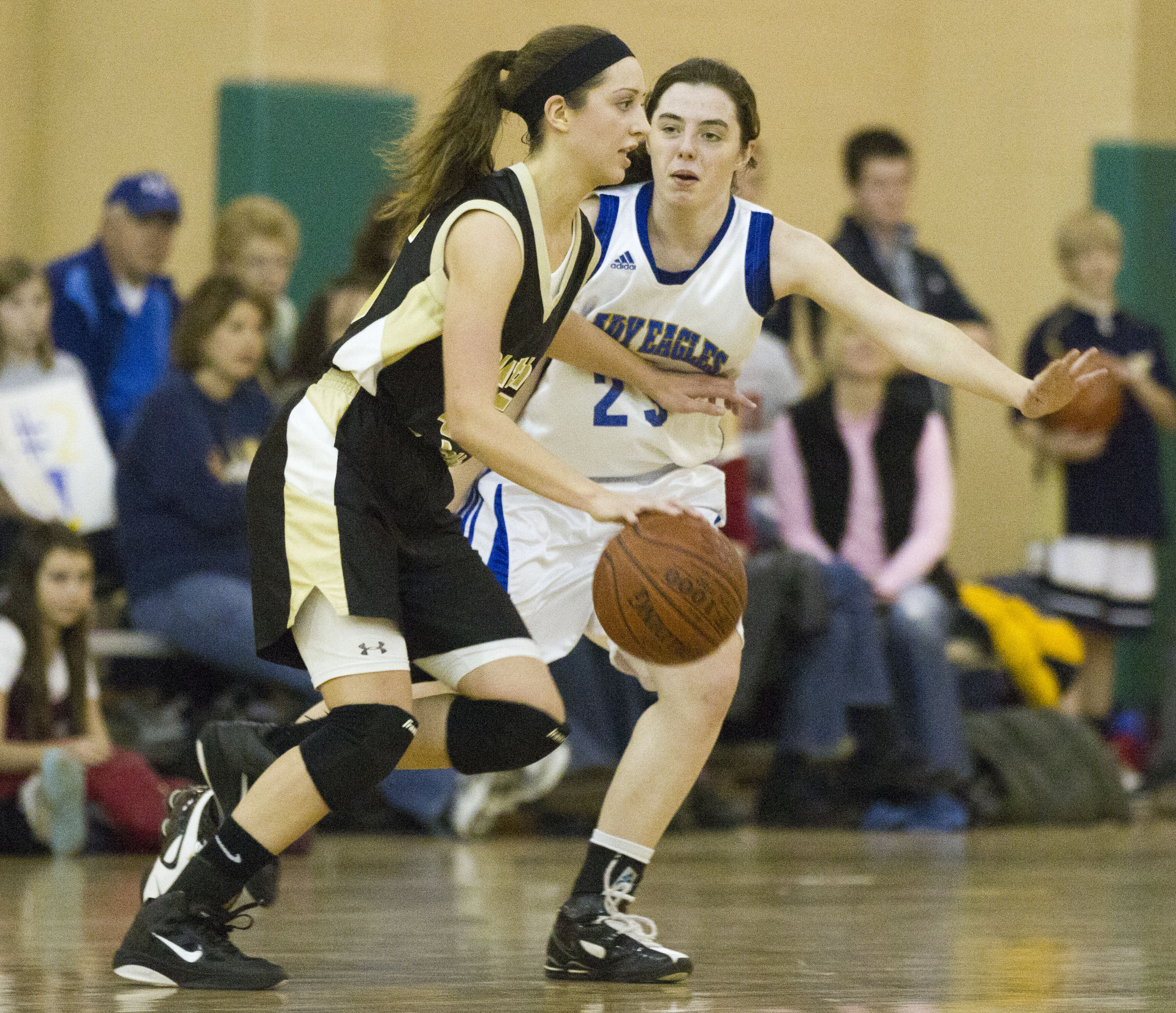 Veritas’ Alison Dover (23) pressures Olathe's Grace Williams during Veritas’ game against Olathe Christian Saturday, Dec. 17, 2011 in Eudora.