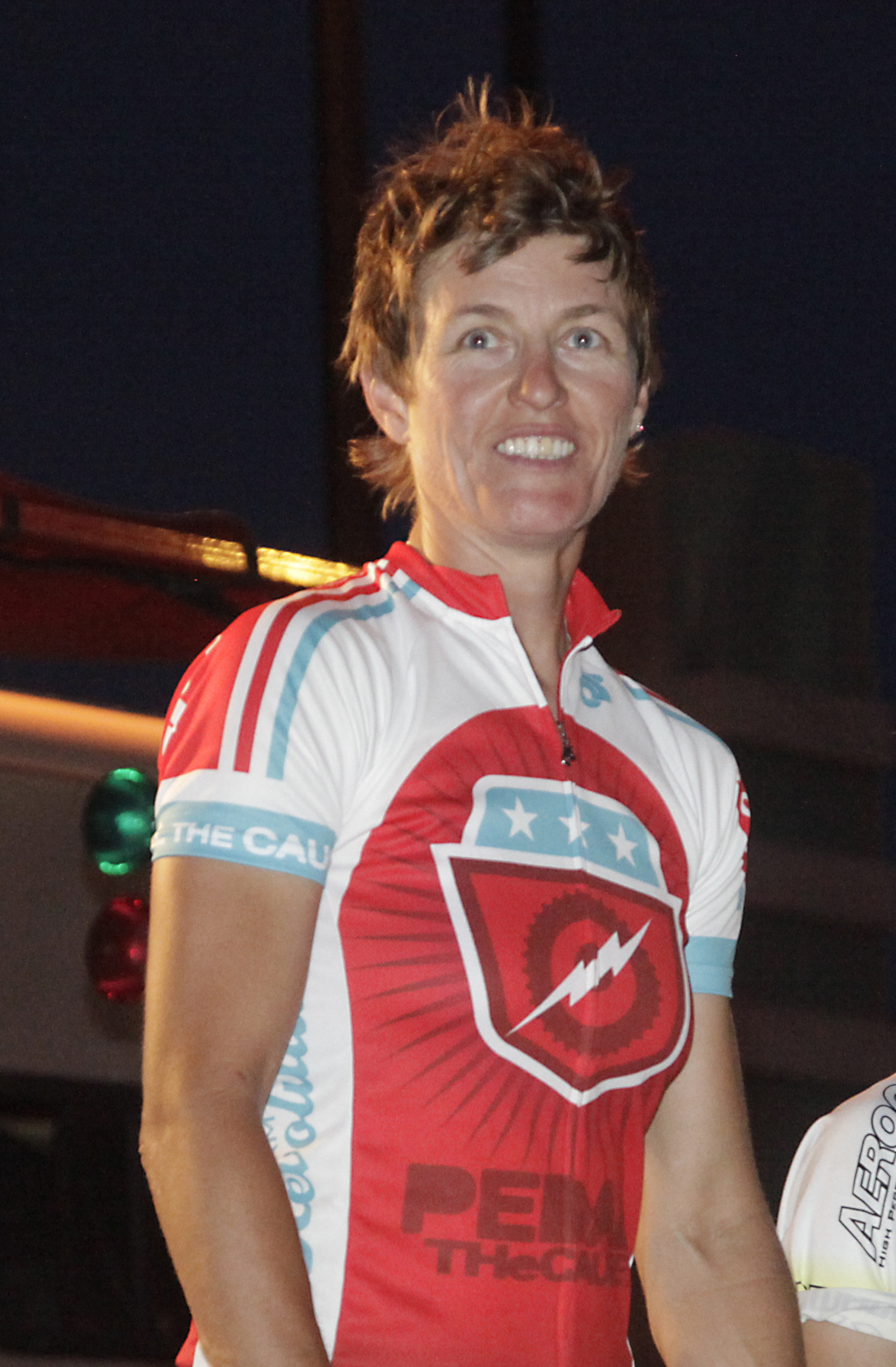 Carrie Cash Wootten, of Pedal the Cause/Team Revolution, stands at the podium as the winner in the women’s class of the Tour of Lawrence street sprints. on Friday, July 1, 2011.