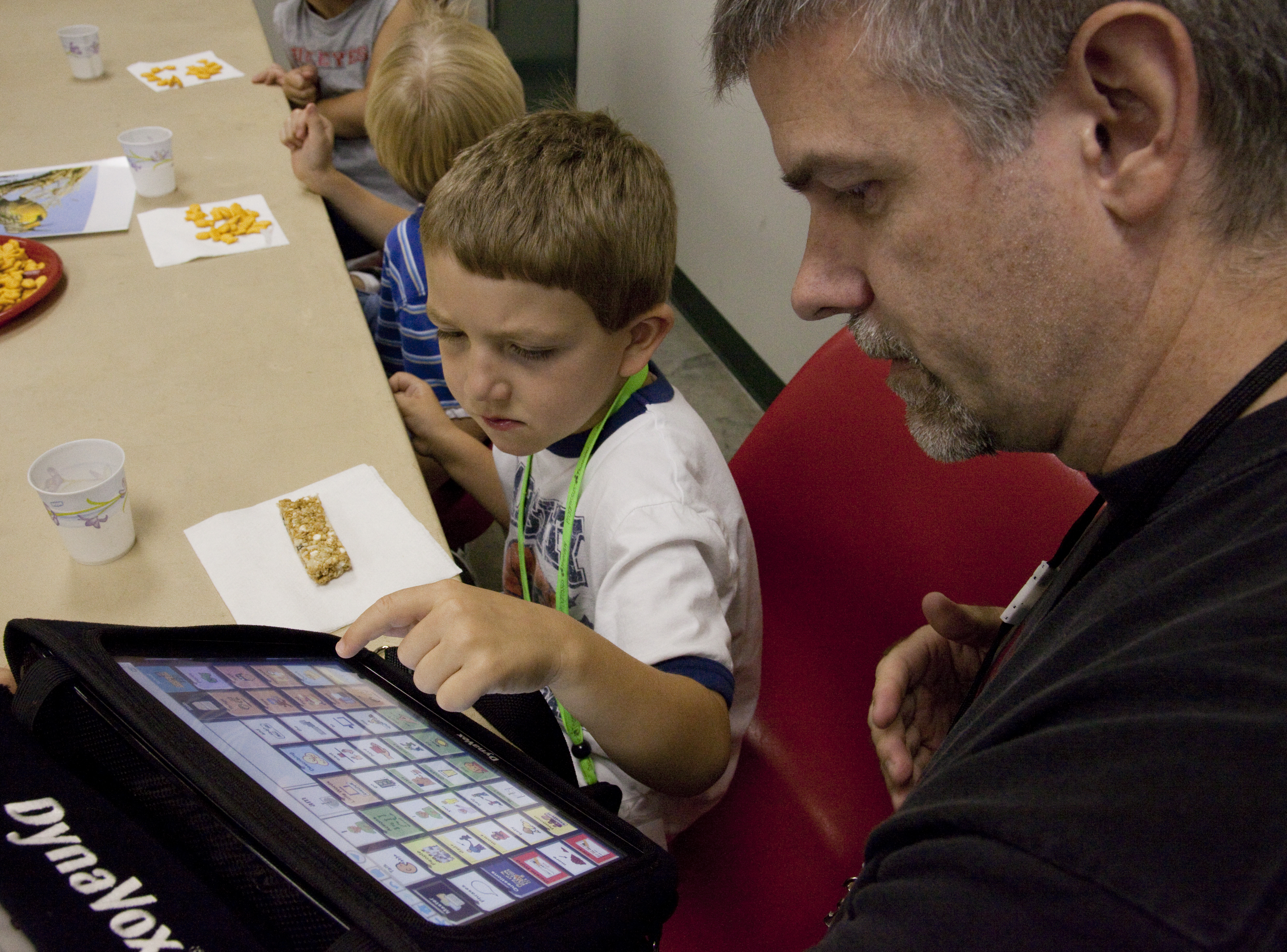 Jared Filbert, 6, uses an augmented communication device to find the words to express himself under the watchful eyes of KU grad student David Davis Thursday, July 7, 2011.