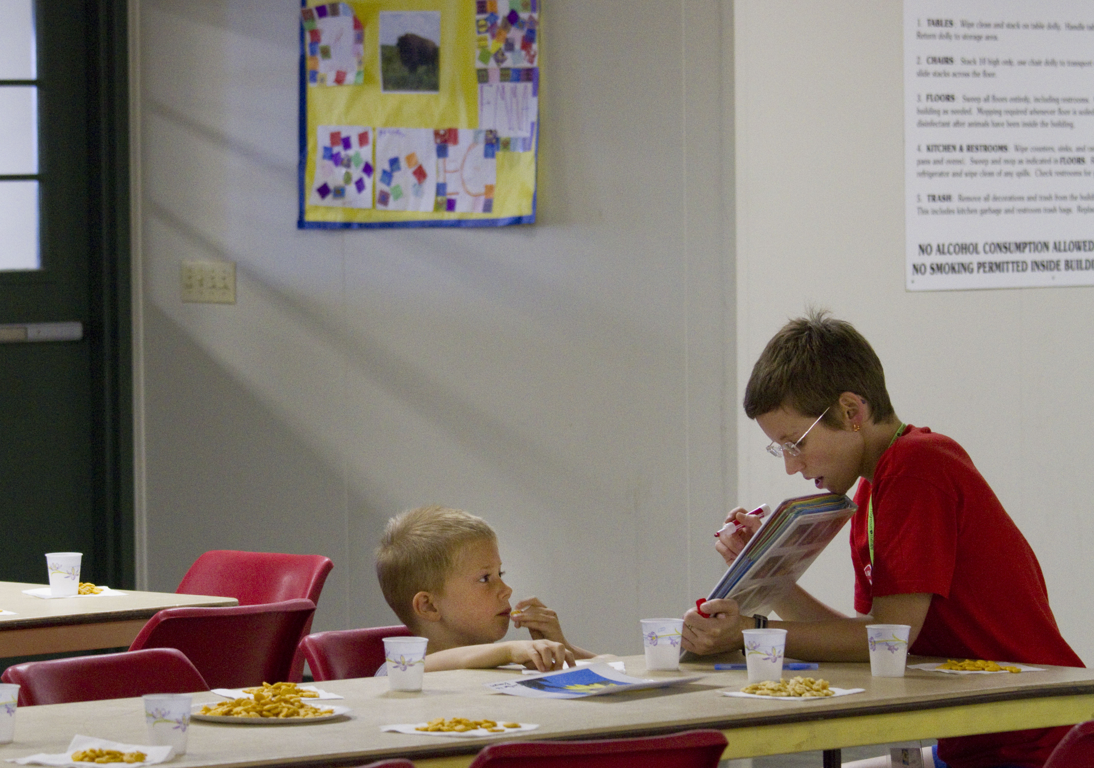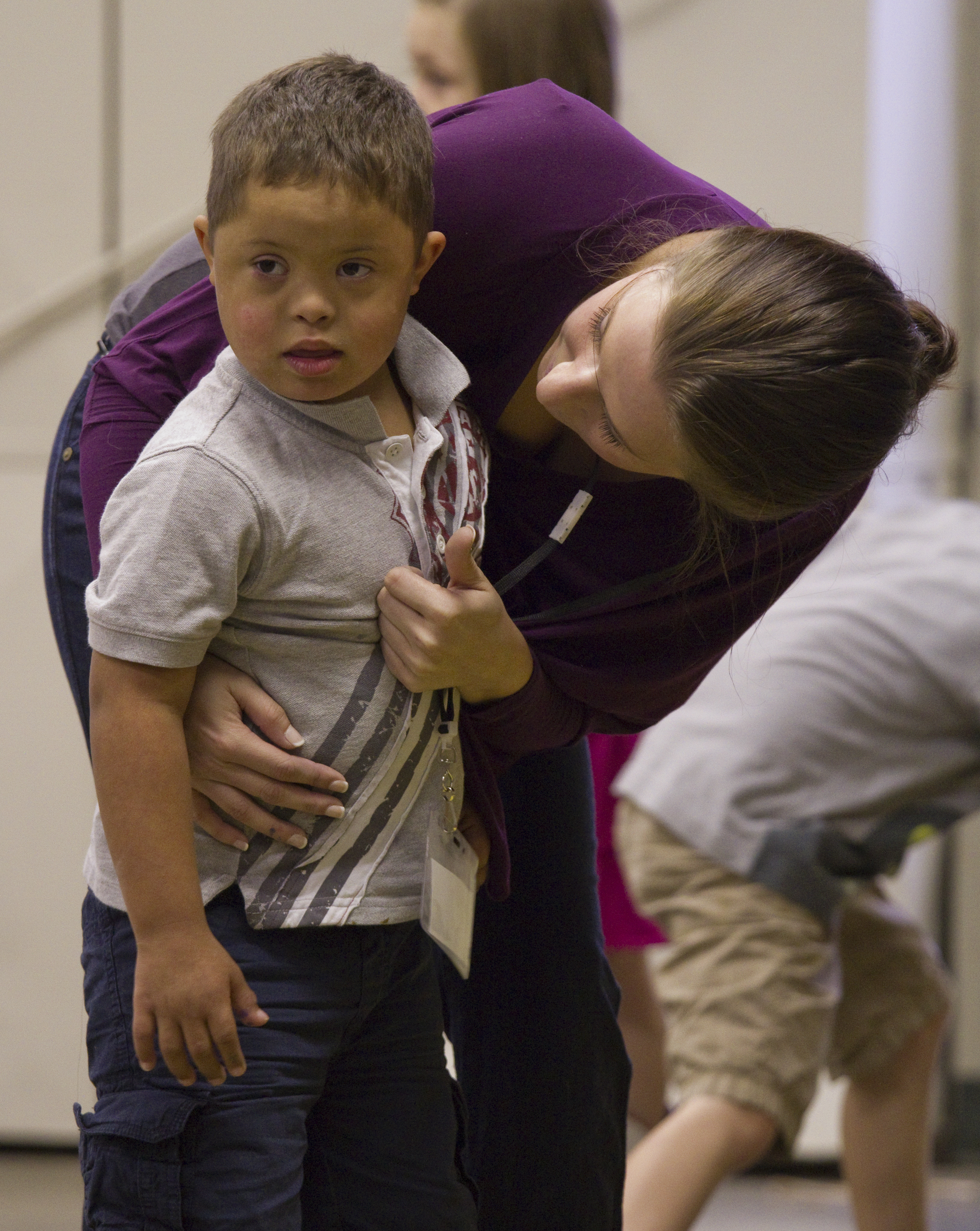 Lindsey Williamson talks with Damien Roseman, 5, during the Sertoma-Schiefelbusch Communication Camp at the Douglas County Fairgrounds Thursday, July 7, 2011. The camp brings together children and youth with and without communication challenges.