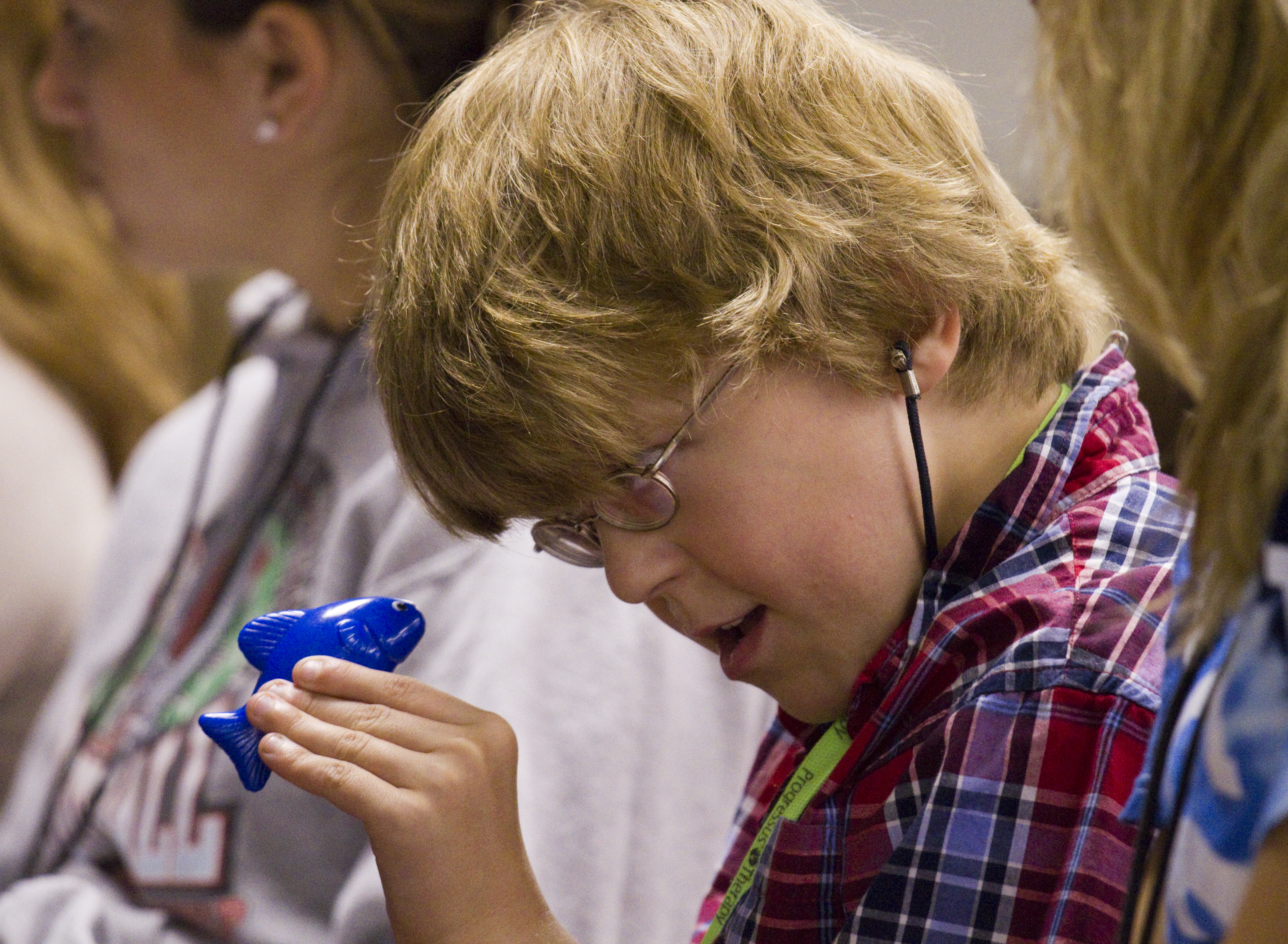 Jesse Stoll, 10, keeps himself entertained with a blue fish during the Sertoma-Schiefelbusch Communication Camp at the Douglas County Fairgrounds Thursday, July 7, 2011.