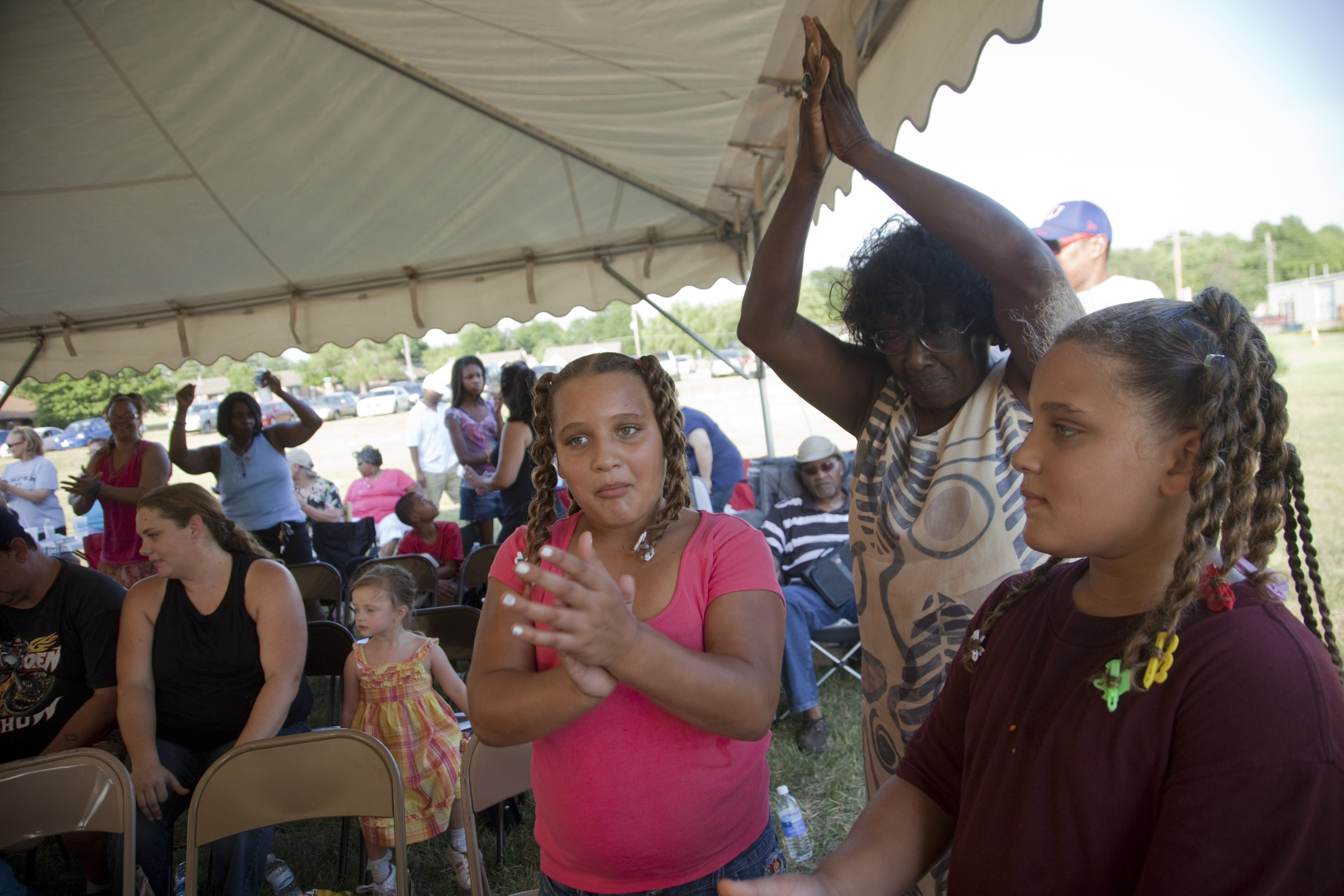 From left, Destini Howard, 10, Agnes Adeboye and Krissy Howard, 10, sing and sway to a gospel song during Wednesday evening’s tent revival in east Lawrence.