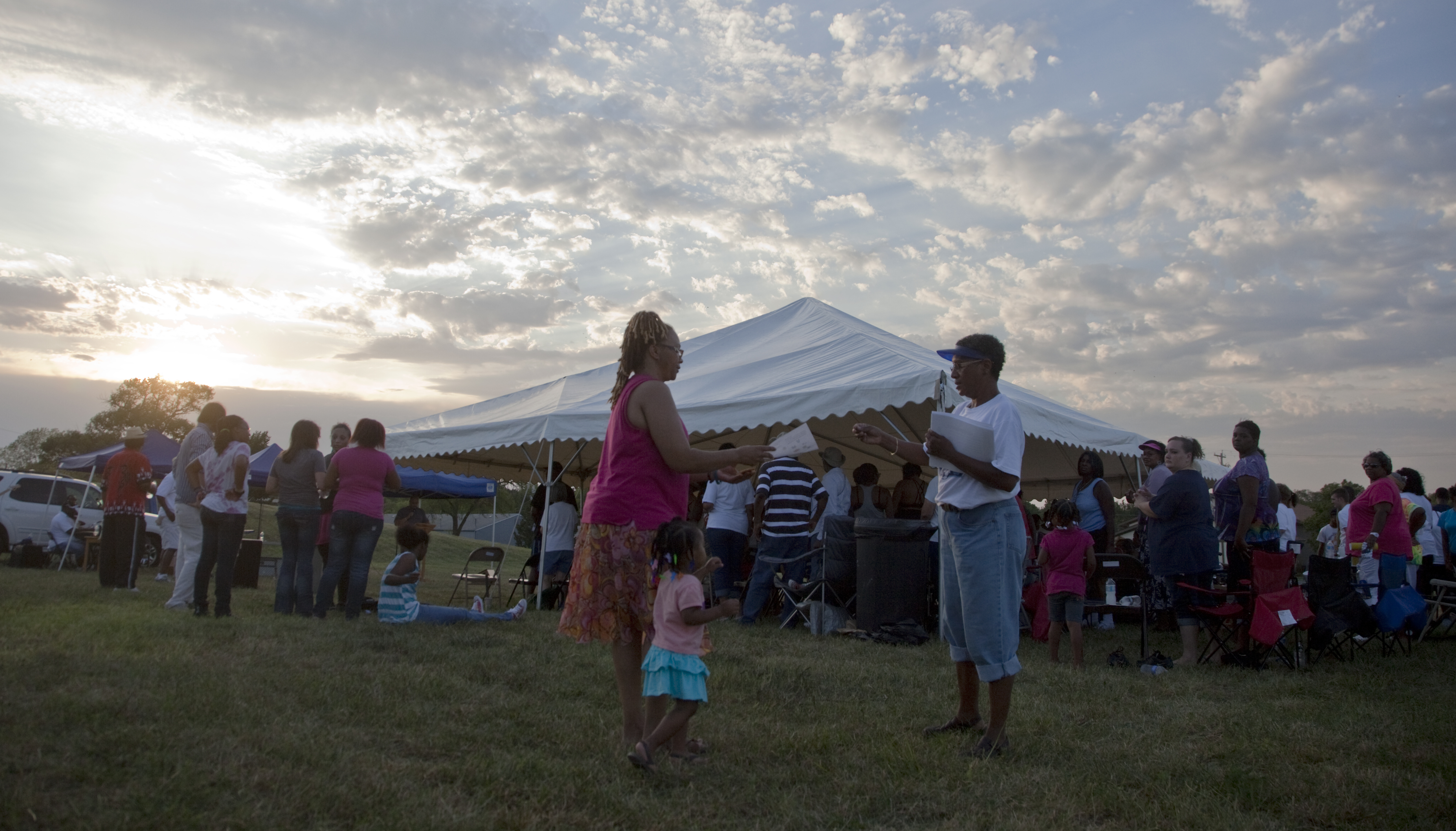 The sun sets behind a bank of clouds as participants share their experiences outside the tent Wednesday at a revival in east Lawrence.