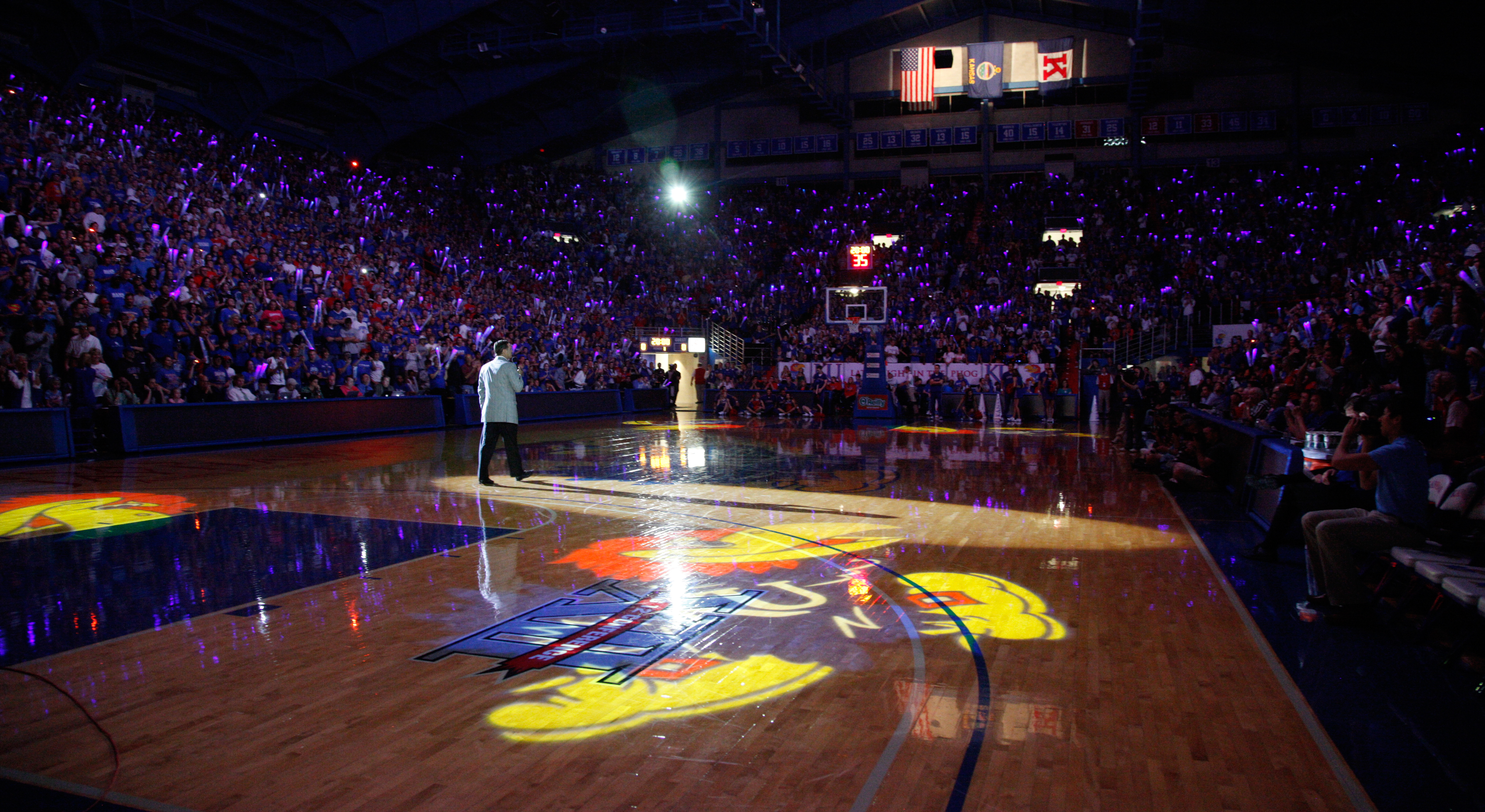 Large Jayhawks are cast onto the court as Kansas head coach Bill Self addresses the crowd during Late Night in the Phog, Friday, Oct. 15, 2010.