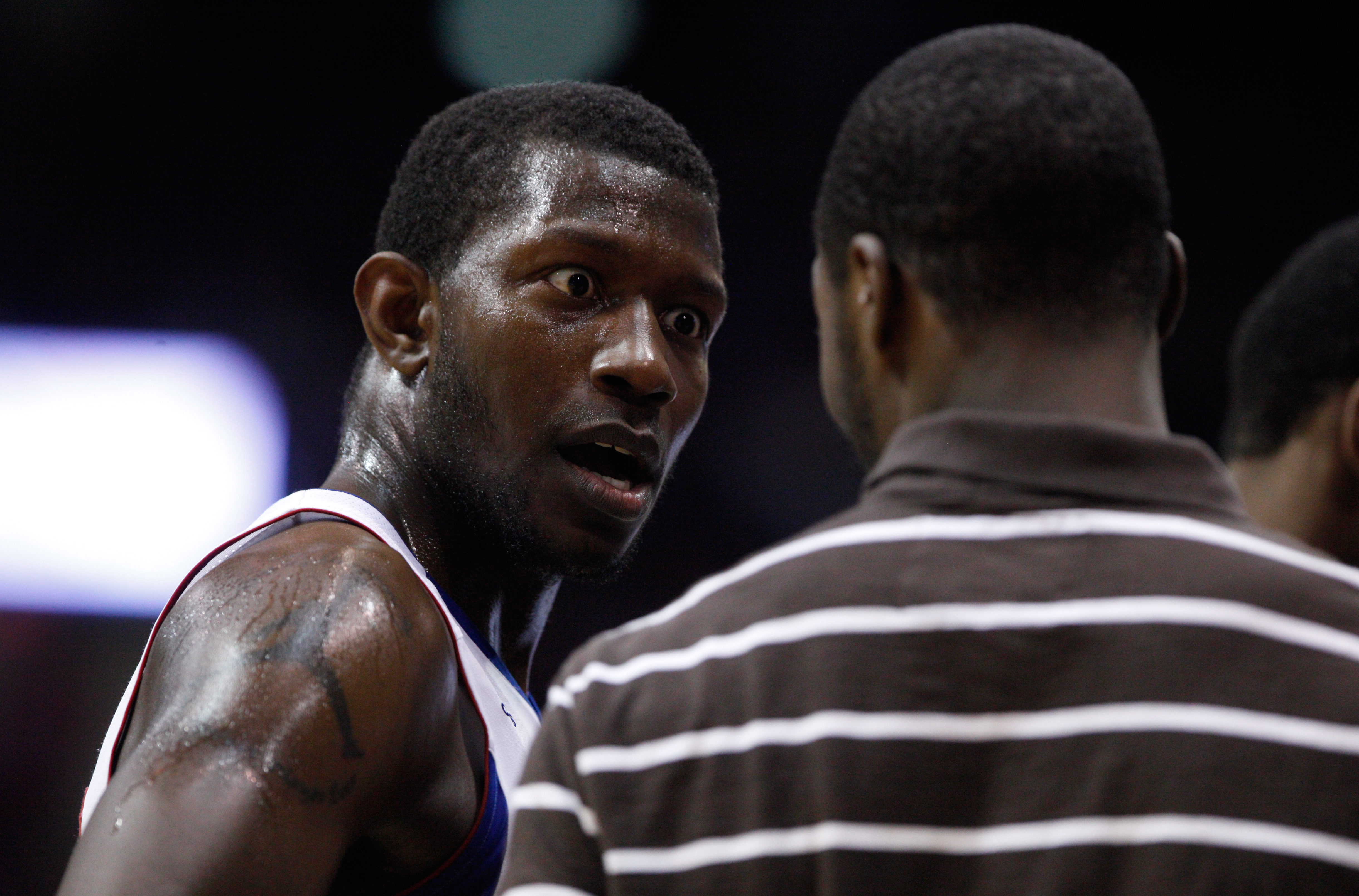 Kansas forward Mario Little looks at teammate Elijah Johnson in disbelief as he jokes around on the bench during a timeout from action against Valparaiso in the second half, Monday, Nov. 15, 2010 at Allen Fieldhouse.