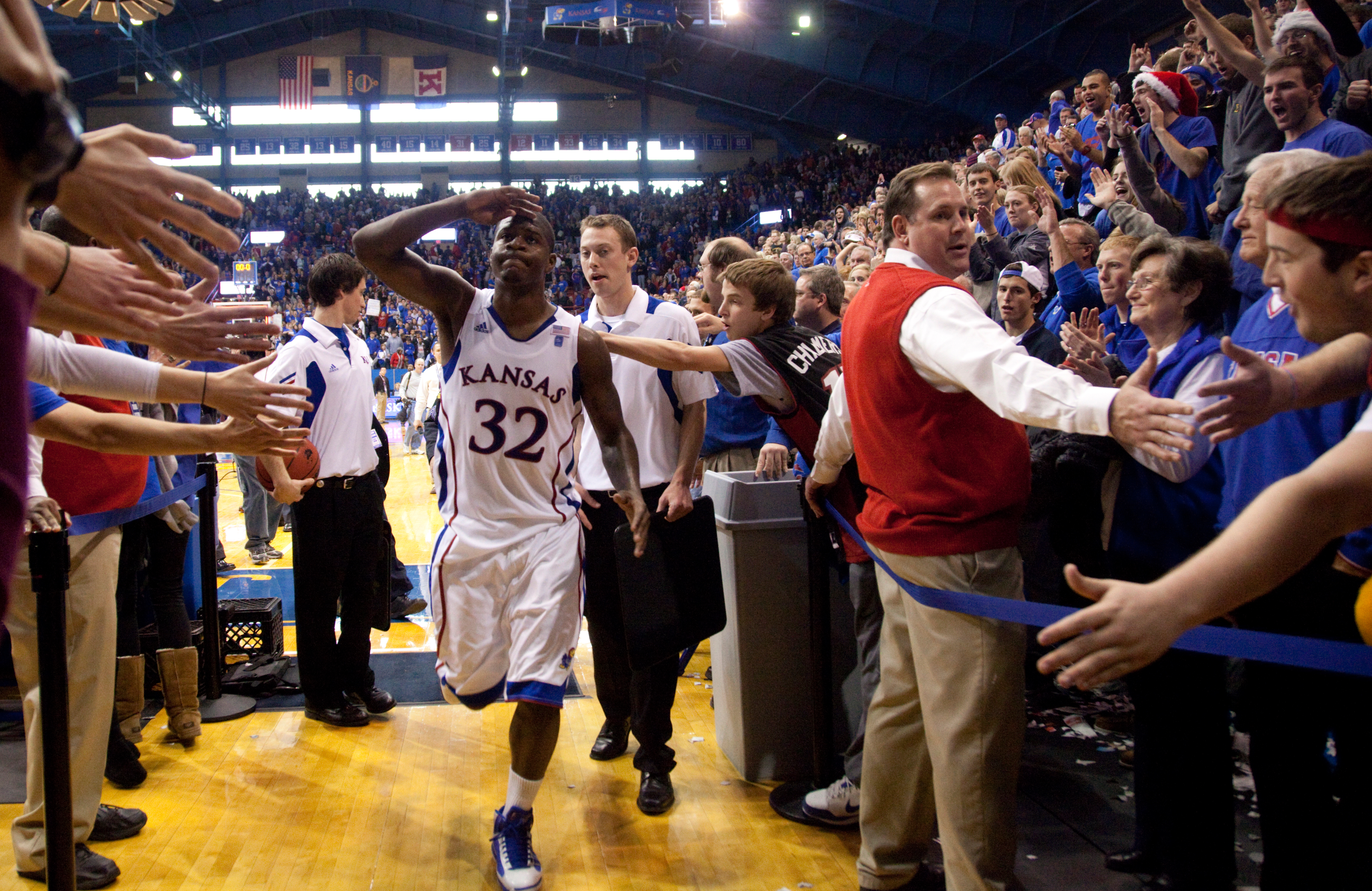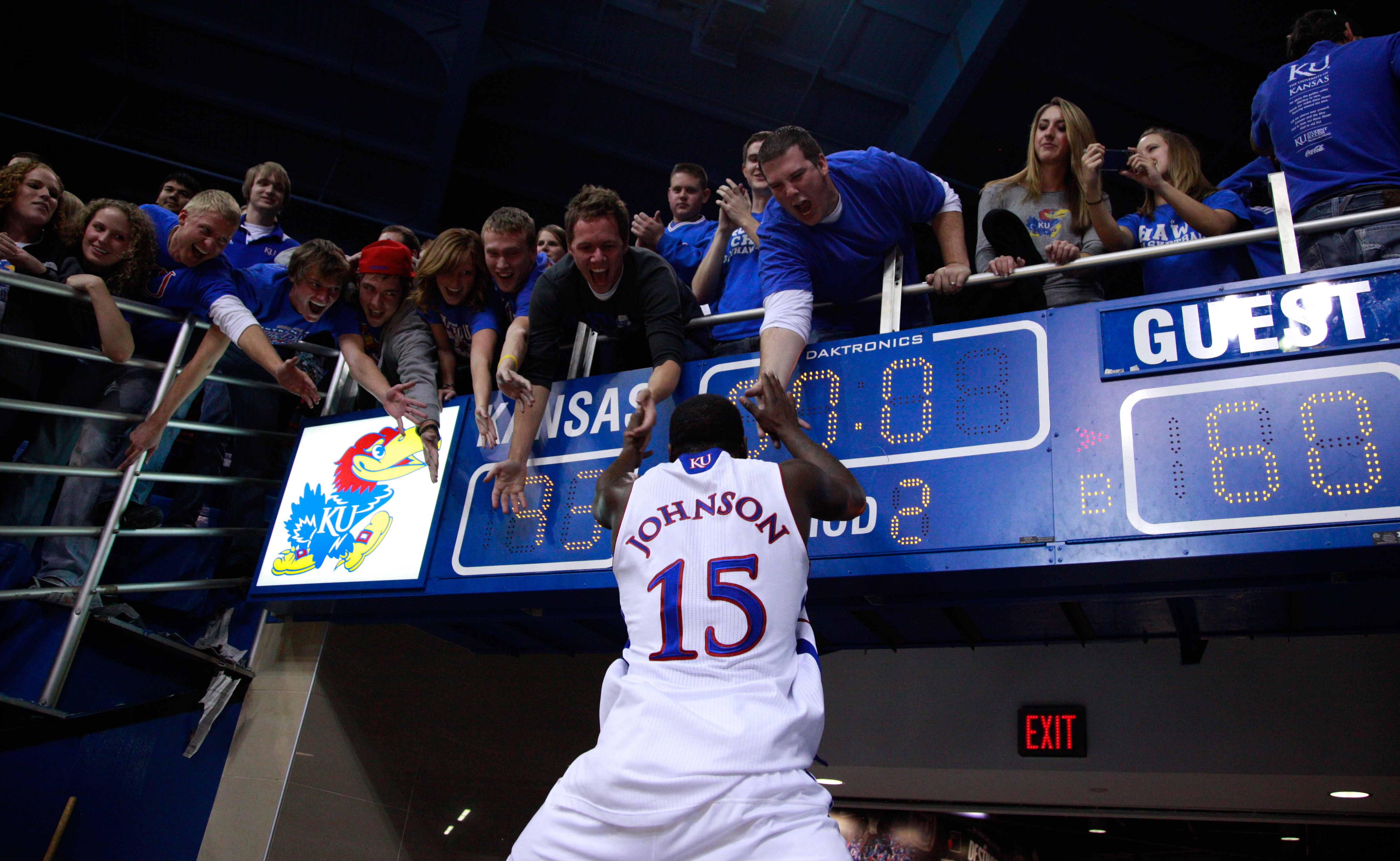 Jayhawk fans above the 93-60 final score receive a flying high five from Kansas guard Elijah Johnson following their win over North Texas Friday, Nov 19, 2010 at Allen Fieldhouse.
