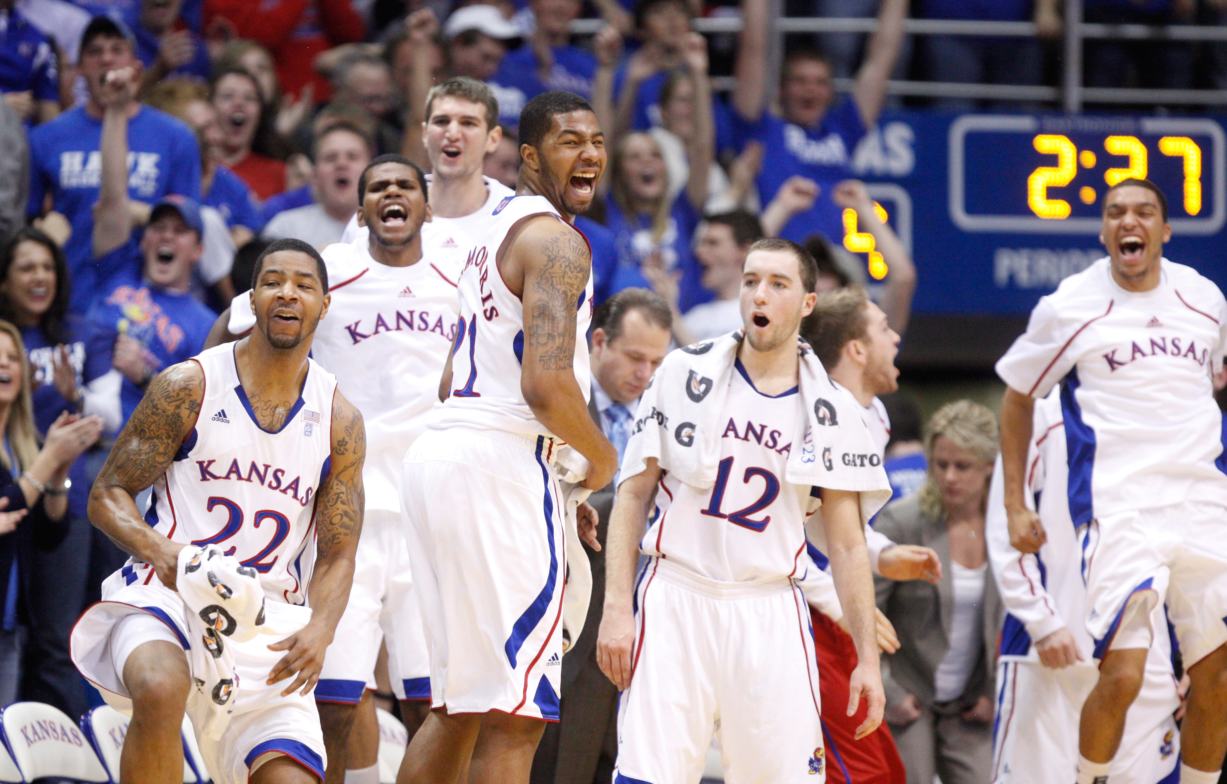 The Kansas bench erupts after a dunk by Jayhawk guard Travis Releford against Texas A&M-Corpus Christi during the first half, Tuesday, Nov. 23, 2010 at Allen Fieldhouse.