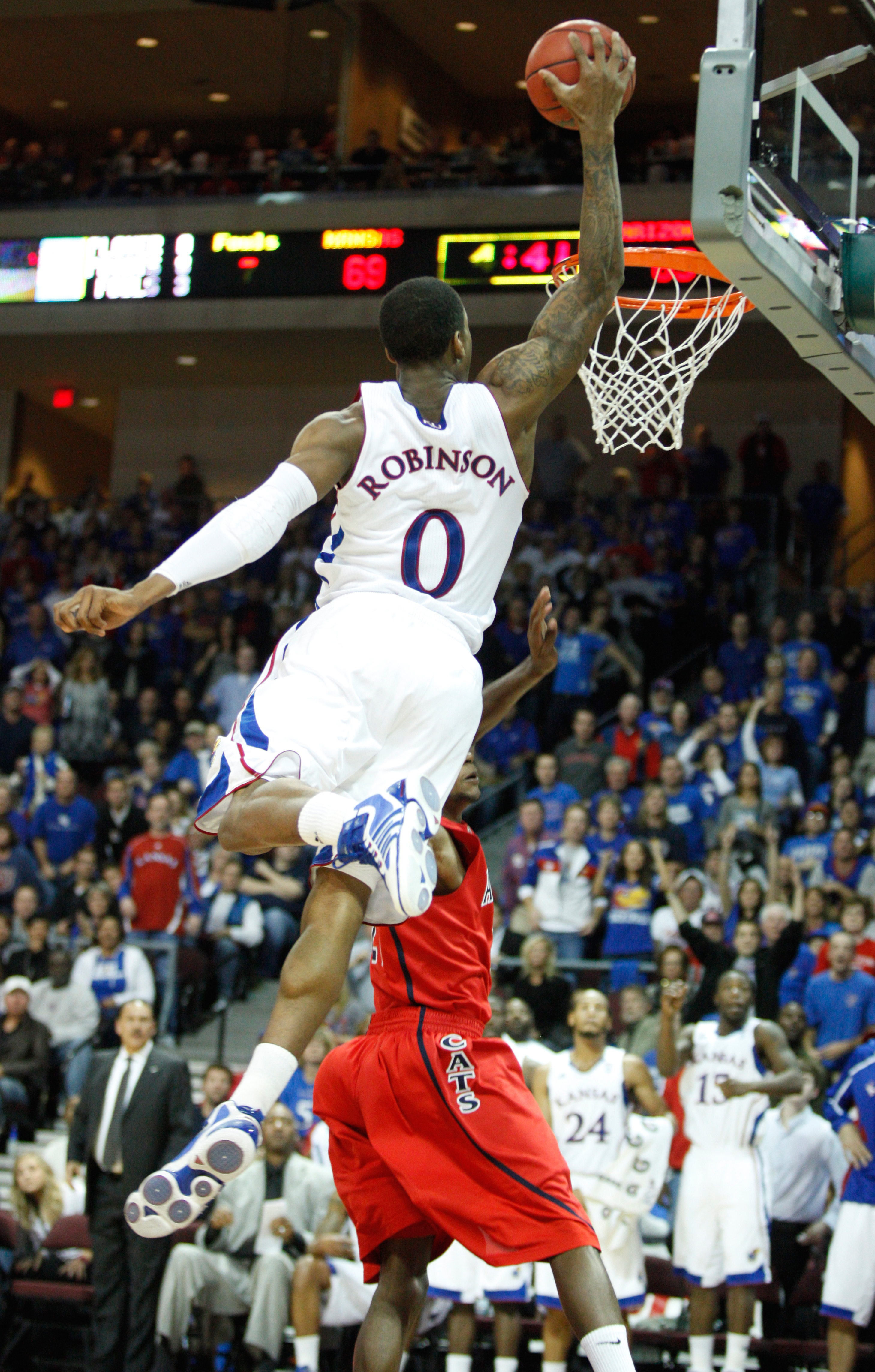 Kansas forward Thomas Robinson soars in for an alley-oop jam against Arizona during the second half of the Las Vegas Invitational, Saturday, Nov. 27, 2010 at the Orleans Arena.