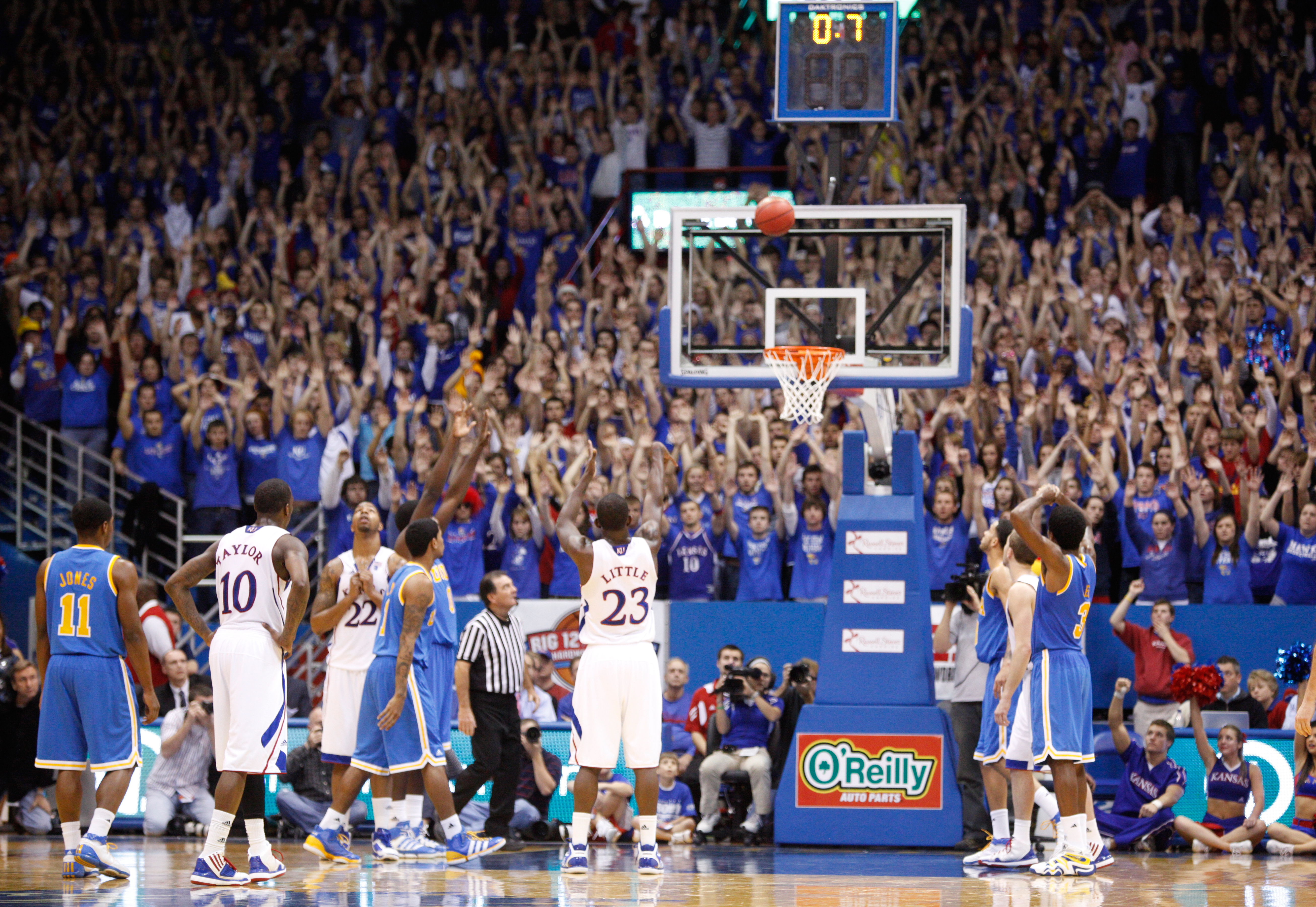 The Fieldhouse watches in anticipation as Kansas forward Mario Little puts up the winning free throw against UCLA with a fraction of a second remaining on the clock during the second half, Thursday, Dec. 2, 2010 at Allen Fieldhouse.