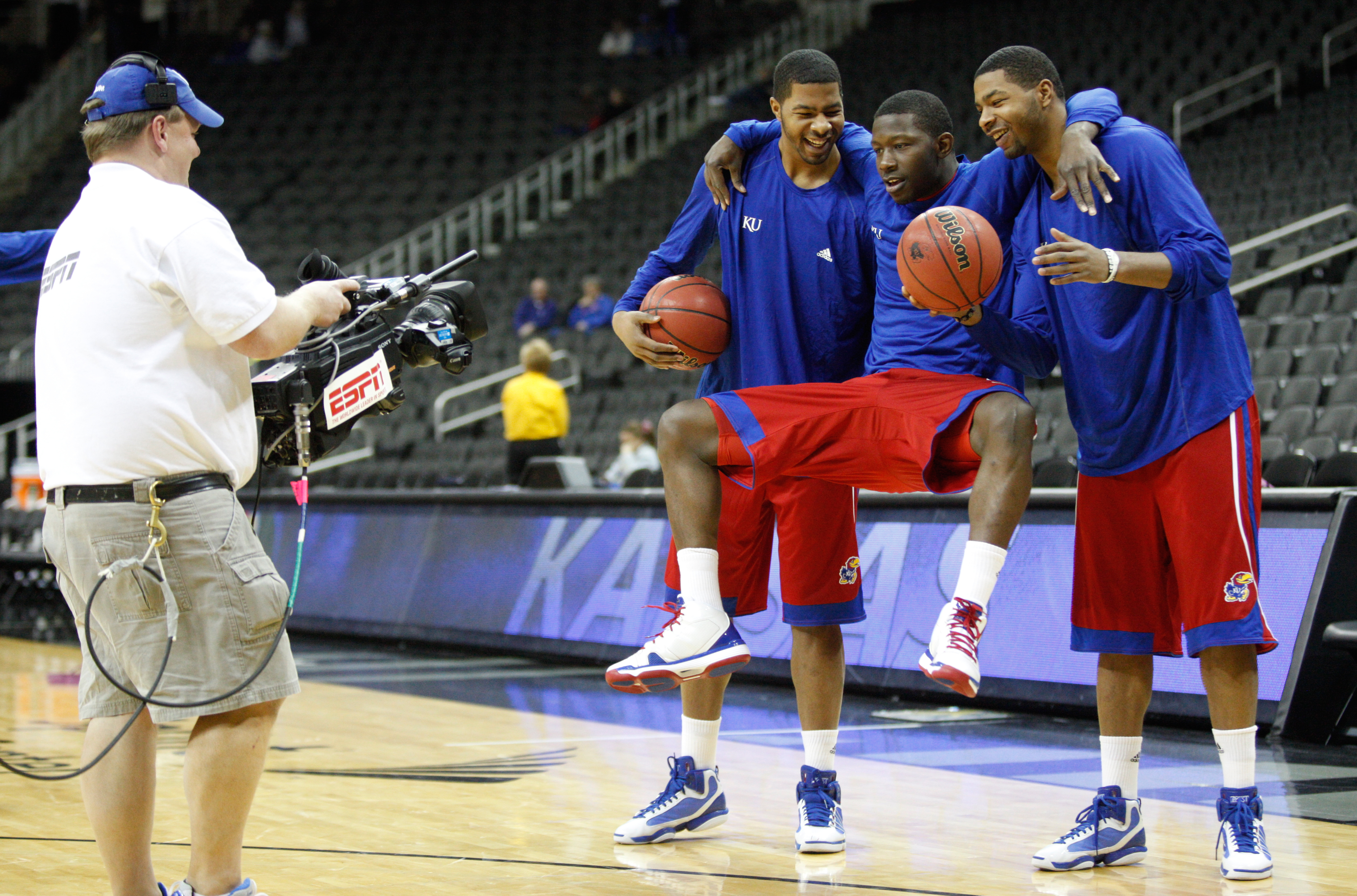 Kansas small forward Mario Little, center, clowns around with the Morris brothers, Markieff, left, and Marcus as an ESPN cameraman shoots some pregame video prior to tipoff against Colorado State, Saturday, Dec. 11, 2010 at the Sprint Center in Kansas City.