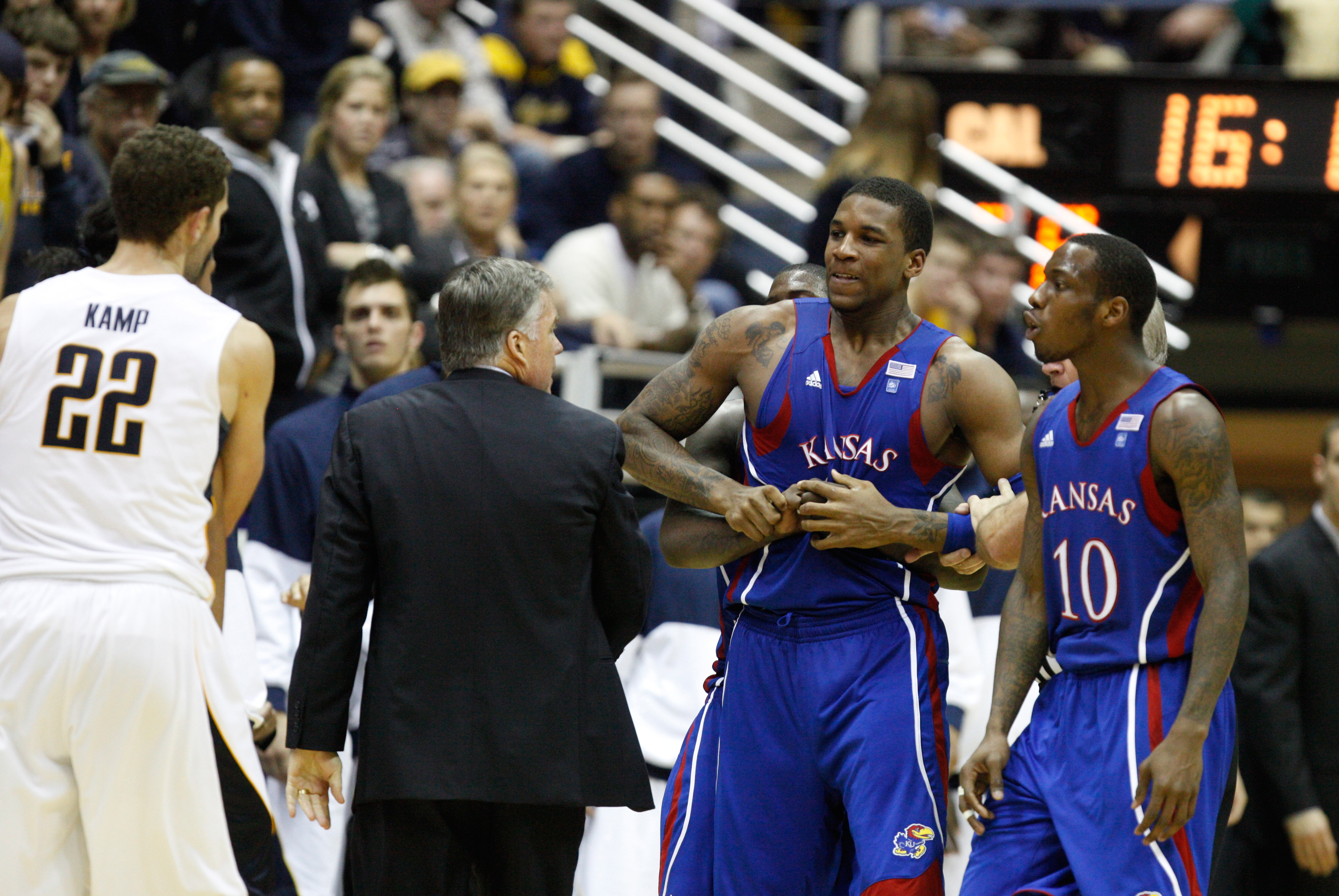 Kansas forward Thomas Robinson tries to break himself from being restrained after tempers flared against Cal during the second half, Wednesday, Dec. 22, 2010 at Haas Pavilion in Berkeley, California.
